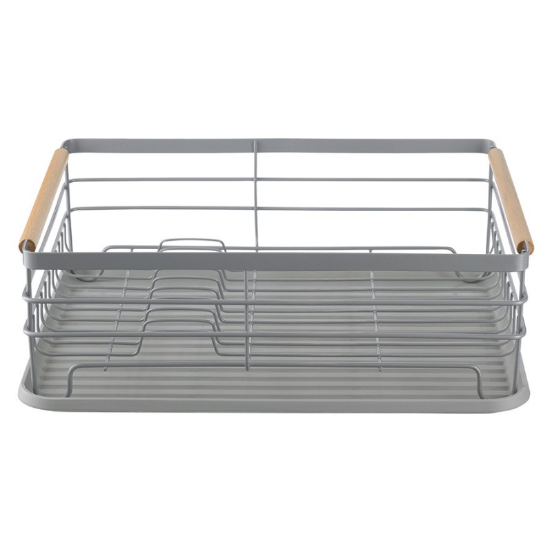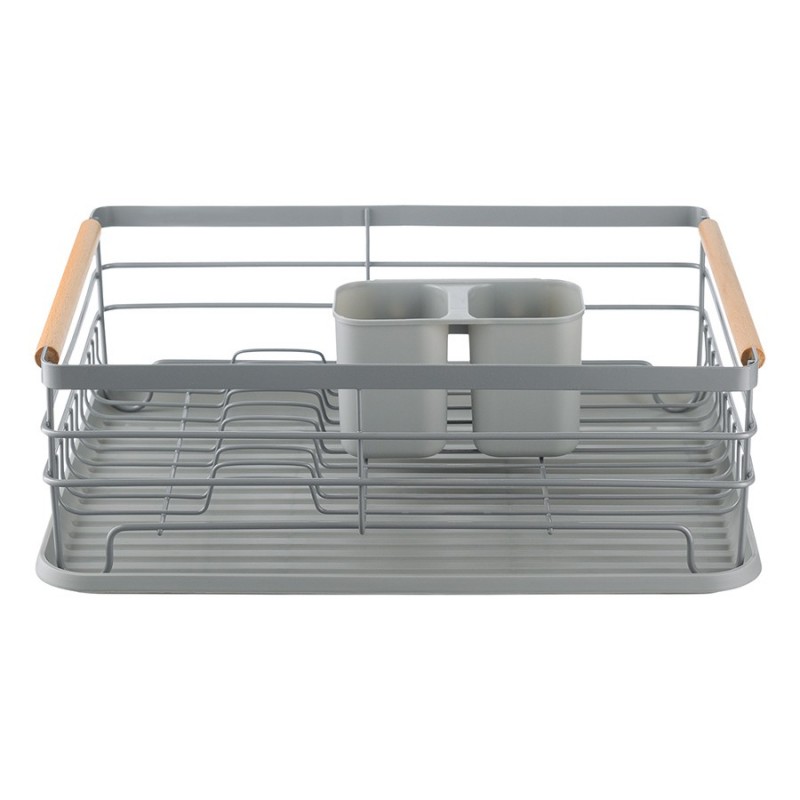 Granli – стильная и удобная сушилка с отделениями для посуды и кухонных принадлежностей.Особенности и преимущества:- Каркас имеет вид железной сетки со специальными изгибами, позволяющими удобно разместить тарелки и другую посуду. - Поддон выполнен из практичного пластика, который легко очищается, не впитывает запахи и загрязнения. - В конструкции предусмотрены съемные контейнеры для столовых приборов, на дне которых имеются отверстия для слива воды. - Деревянные ручки делают дизайн интересным и обеспечивают комфортное перемещение сушилки.Материалы: железо, полипропилен, дерево. Размеры: 43x30,5x14 см. Цвет: серый.Рекомендуется очищать от загрязнений в теплой воде с помощью мягкой губки с жидким средством. Съемные элементы можно мыть в посудомоечной машине. Запрещается использование агрессивной бытовой химии и абразивных материалов.