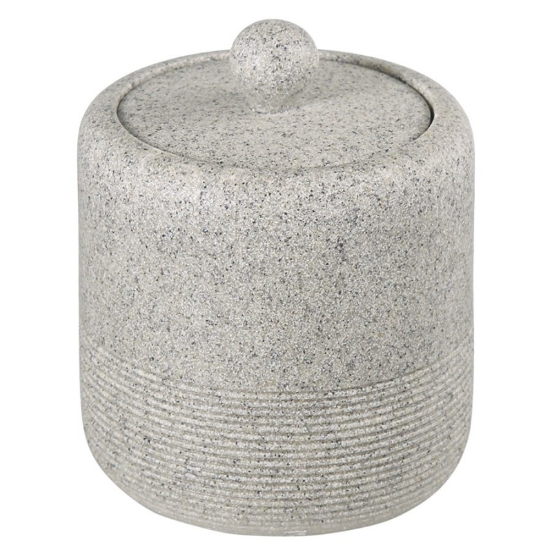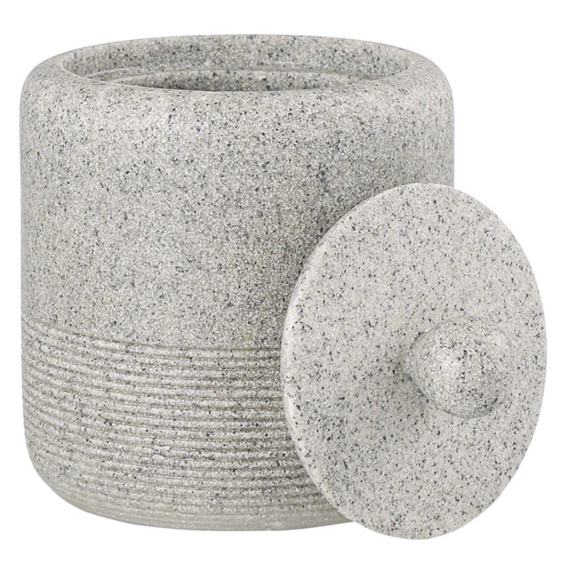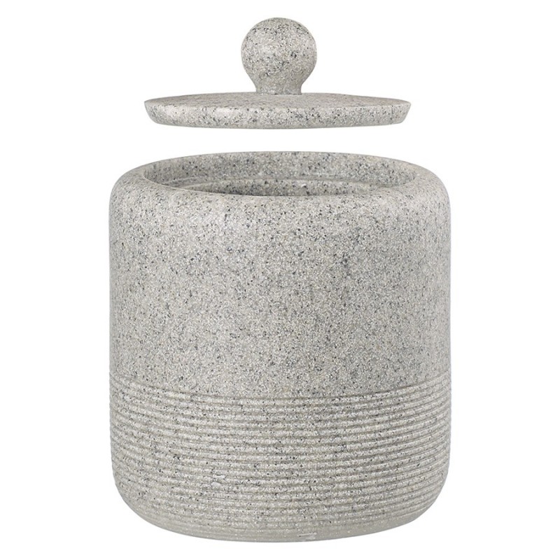 Банка для хранения Loup имеет корпус и крышку из полирезина, стилизованного под натуральный камень темно-серого оттенка. Материал легко моется, отличается устойчивостью к влаге, ударам и царапинам, что делает его идеальным выбором для ванной комнаты. Емкость компактных размеров занимает минимум места на полке или в шкафу. В такой банке можно удобно хранить средства гигиены и другие предметы личного пользования.Коллекция аксессуаров Loup сделает пространство вашей ванной комнаты более комфортным и функциональным. Имитация фактуры натурального камня и естественные оттенки привнесут в интерьер нотки природной элегантности. Линейка понравится поклонникам скандинавского стиля и минималистичных интерьеров, где предпочтение отдается простым формам и спокойной цветовой гамме.Материалы: полирезин. Размеры: 9,5х12 см. Объем: 430 мл. Цвет: темно-серый.Банку можно очищать в теплой воде с помощью мягких моющих средств. Запрещается использование агрессивной бытовой химии и абразивных материалов.