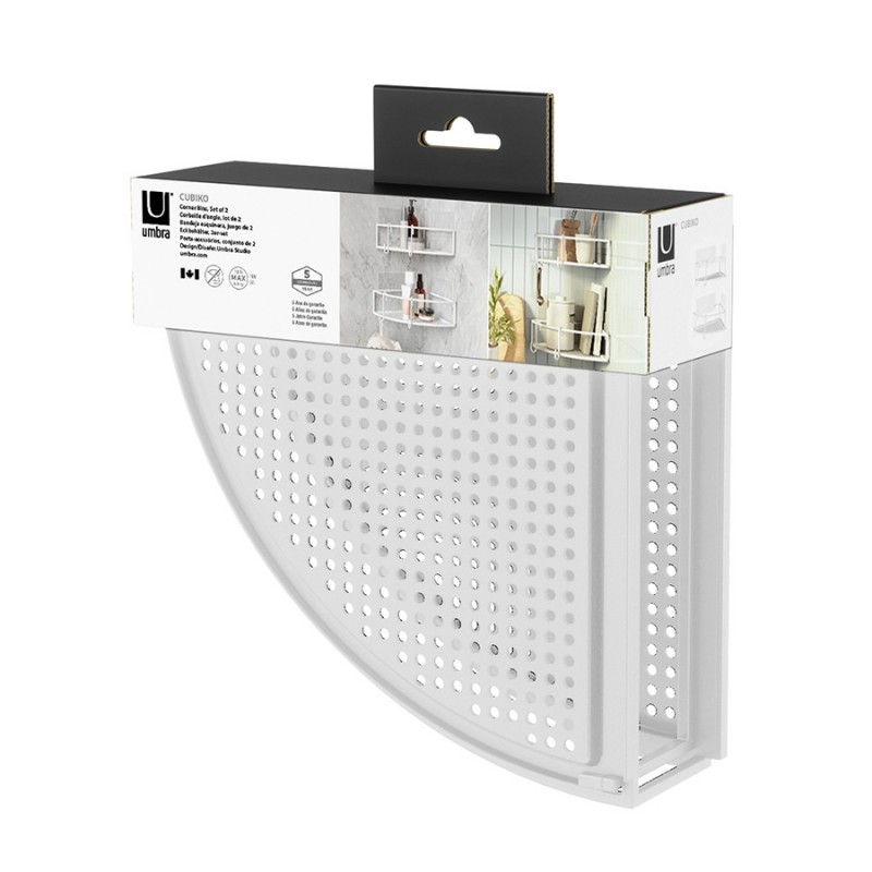Полки Cubiko сделают интерьер душевой или ванной комнаты более комфортным и функциональным. Изделия из высокопрочной, устойчивой к коррозии стали имеют продолжительный срок службы и сохраняют привлекательный вид долгие годы. Угловые конструкции позволяют грамотно задействовать пространство и благодаря современному дизайну легко интегрируются в любое оформление. В комплекте предусмотрены специальные крючки, которые можно использовать для размещения полотенец, мочалки и других аксессуаров. Полки крепятся на влагостойкие клейкие ленты, которые можно использовать на любых поверхностях, кроме пористых: плитка, гипсокартон, бетон и другие.Материал: сталь. Размеры: 23x23x8 см. Вес: 860 г. Максимальная нагрузка: 4,5 кг. Цвет: белый.Пыль и загрязнения с поверхностей можно удалять при помощи мягкого влажного материала.