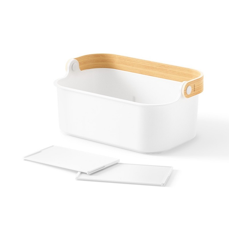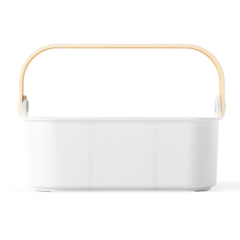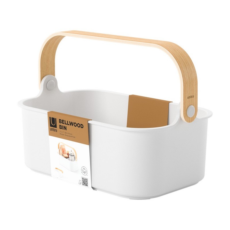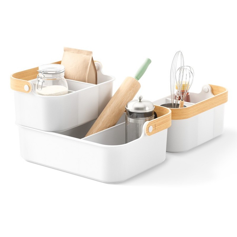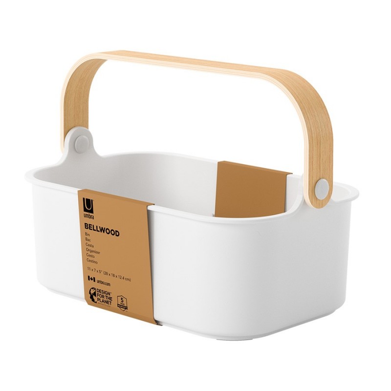Органайзер Bellwood поможет организовать компактное хранение продуктов и вещей в любой из комнат. Специальные разделители позволяют удобно размещать и сортировать предметы. Органайзер на 80% выполнен из переработанного АБС-пластика, известного своей прочностью, устойчивостью к износу и долговечностью. Он оснащен ручкой из древесины, которая обеспечивает простую переноску, а также делает дизайн привлекательным и интересным.Материалы: переработанный АБС-пластик, тополь, ясень, нейлон, силикон. Размеры: 29х17х20 см. Цвет: белый/натуральное дерево.Пыль и загрязнения с поверхностей можно удалять при помощи мягкого влажного материала. Запрещается использование абразивов и агрессивной бытовой химии.