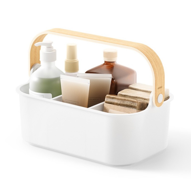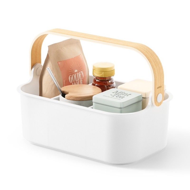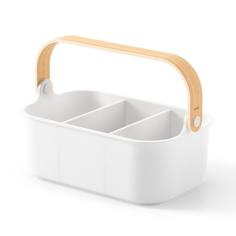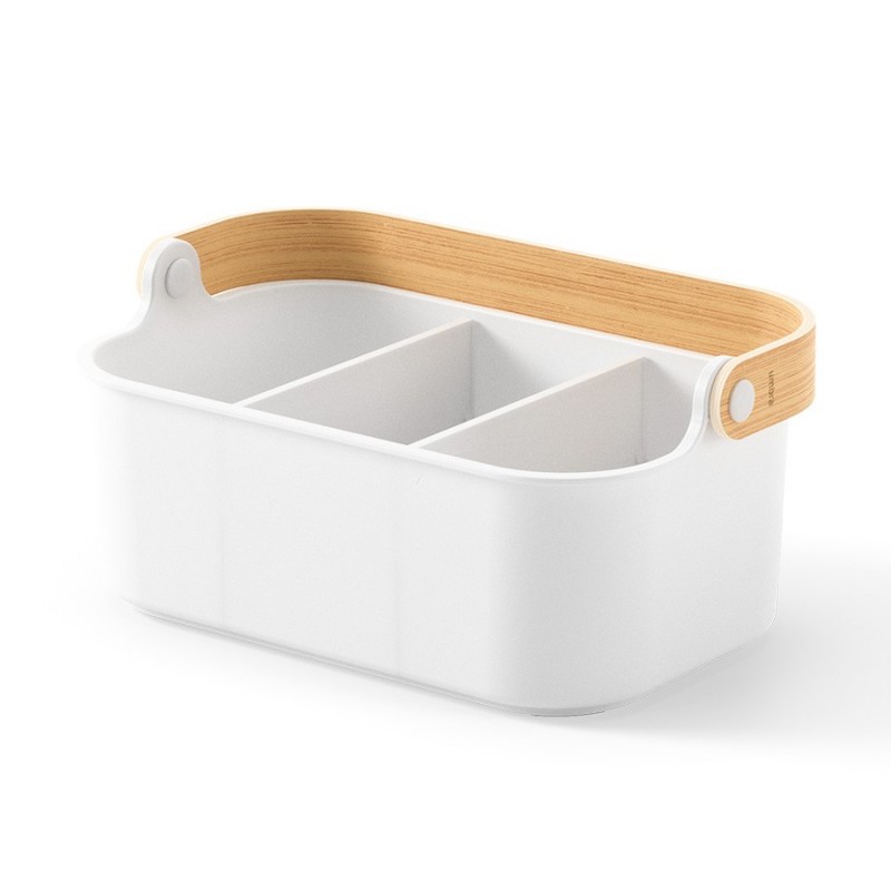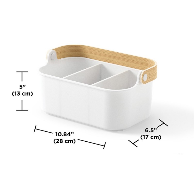 Органайзер Bellwood поможет организовать компактное хранение продуктов и вещей в любой из комнат. Специальные разделители позволяют удобно размещать и сортировать предметы. Органайзер на 80% выполнен из переработанного АБС-пластика, известного своей прочностью, устойчивостью к износу и долговечностью. Он оснащен ручкой из древесины, которая обеспечивает простую переноску, а также делает дизайн привлекательным и интересным.Материалы: переработанный АБС-пластик, тополь, ясень, нейлон, силикон. Размеры: 29х17х20 см. Цвет: белый/натуральное дерево.Пыль и загрязнения с поверхностей можно удалять при помощи мягкого влажного материала. Запрещается использование абразивов и агрессивной бытовой химии.