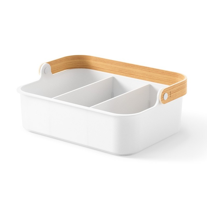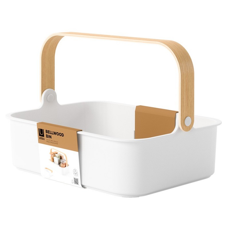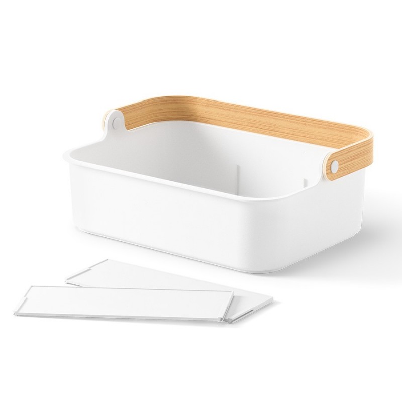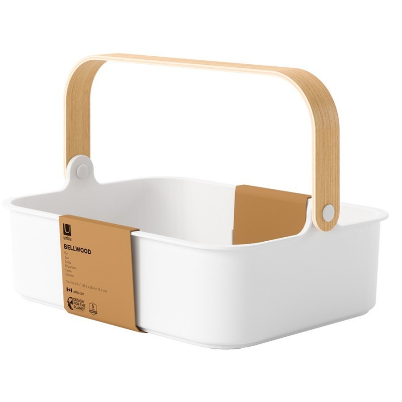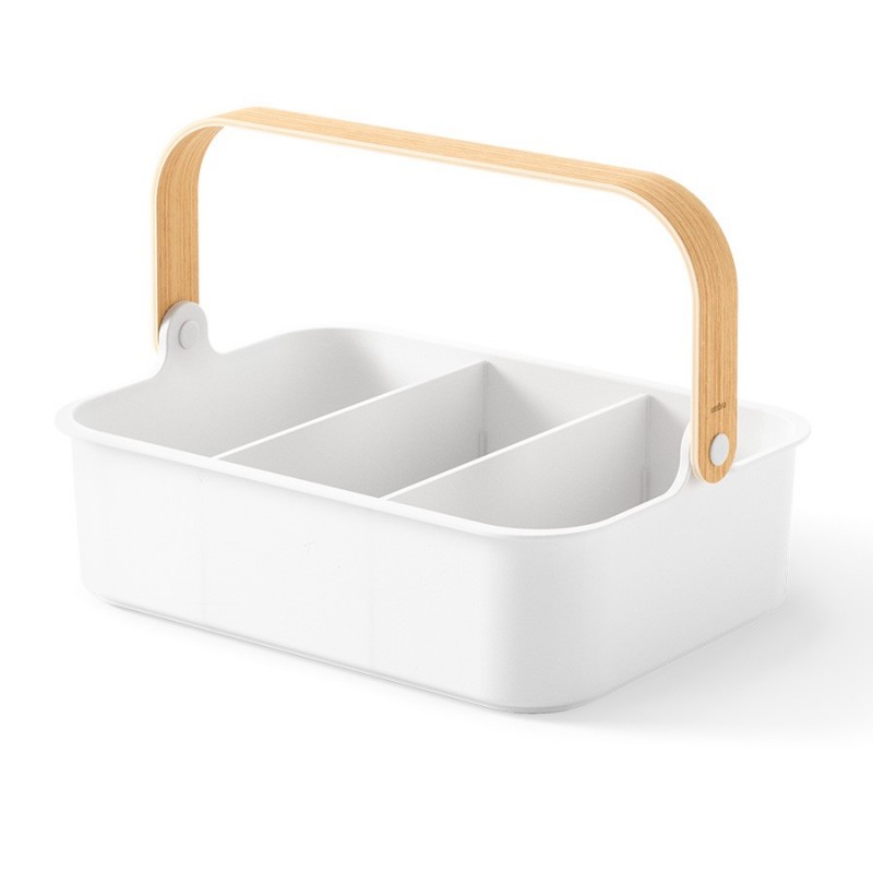 Органайзер Bellwood поможет организовать компактное хранение продуктов и вещей в любой из комнат. Специальные разделители позволяют удобно размещать и сортировать предметы. Органайзер на 80% выполнен из переработанного АБС-пластика, известного своей прочностью, устойчивостью к износу и долговечностью. Он оснащен ручкой из древесины, которая обеспечивает простую переноску, а также делает дизайн привлекательным и интересным.Материалы: переработанный АБС-пластик, тополь, ясень, нейлон, силикон. Размеры: 37х27х25 см. Цвет: белый/натуральное дерево.Пыль и загрязнения с поверхностей можно удалять при помощи мягкого влажного материала. Запрещается использование абразивов и агрессивной бытовой химии.