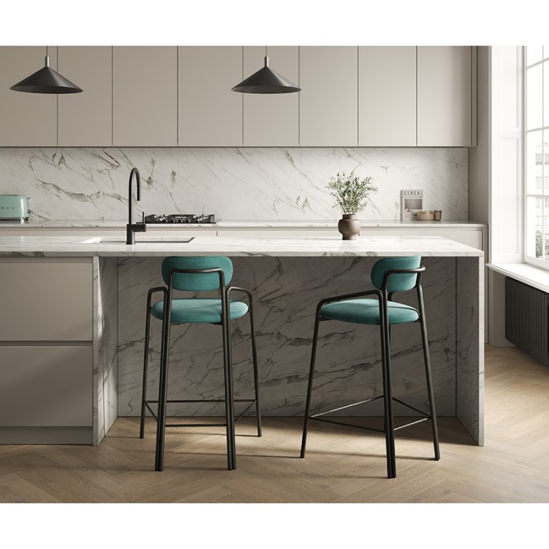 Коллекция Ror - это мебель с индивидуальным характером.Каркас полубарного стула Round состоит из трех стремящихся вверх элементов, которые образуют округлый, словно окутывающий корпус. За счет отсутствия прямых углов создается легкий, гармоничный силуэт. Стальное основание с порошковым покрытием делает конструкцию прочной и надежной, а мягкий велюр с бархатистой текстурой обеспечивает тактильный комфорт. Ткань обивки обладает высокими показателями износостойкости. Используемый в качестве наполнителя пенополиуретан отличается комфортной плотностью и жесткостью. Все материалы отвечают высоким стандартам практичности, долговечности и экологической безопасности. Стул украсит собой любой современный интерьер: подойдет для оформления обеденной группы с высоким столом, барной зоны в кафе и ресторане.Материалы: сталь, фанера, 100% пенополиуретан, 100% полиэстер. Размеры: 53х60х88 см. Высота сиденья: 67 см. Ширина сиденья: 41 см. Глубина сиденья: 41 см. Высота спинки: 24 см. Ширина спинки: 31 см. Максимальная нагрузка: 102 кг. Цвет: черный/светло-бирюзовый.Загрязнения удалять с поверхностей мыльным раствором воды при помощи мягкой губки или салфетки.