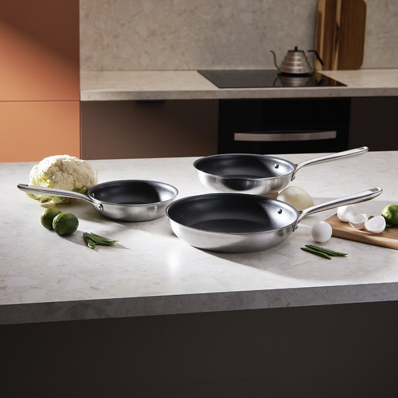 Сковорода 3Ply Etalon, изготовленная по инновационной технологии TRI-PLY, с антипригарным покрытием Teflon Platinum поможет получить настоящее удовольствие от готовки и позволит почувствовать себя настоящим шеф-поваром на собственной кухне.Особенности и преимущества:- Сковорода изготовлена из высококачественной нержавеющей стали 18/10, благодаря чему долго служит, сохраняя первозданный вид. - Дно и стенки из нержавеющей стали толщиной 2,5 мм с внутренним слоем из алюминия обеспечивают равномерное распределение тепла. - Посуда с толстым дном и стенками менее подвержена вмятинам и повреждениям. - Трехслойное покрытие Теflon Platinum не боится царапин, предотвращает прилипание продуктов, не выделяет вредных веществ и легко моется. - Устойчивая к нагреву ручка гарантирует безопасное и удобное использование. - Сковорода подходит для всех видов плит, включая индукционные, газовые и электрические. - Благодаря матовой поверхности посуда 3Ply Etalon выглядит невероятно стильно, что делает ее украшением любой современной кухни.Посуда из нержавеющей стали 3Ply Etalon изготовлена по инновационной технологии TRI-PLY – ее стенки и дно имеют два слоя стали, между которыми предусмотрен слой алюминия. Эта особенность обеспечивает изделиям превосходную теплопроводность, практичность и долговечность. Коллекция идеально подходит для любых типов плит и впечатляет трендовым дизайном – сочетание современных форм и матовой поверхности делает ее настоящим украшением любой кухни.Материал: нержавеющая сталь, алюминий, антипригарное покрытие Теflon Platinum. Диаметр по краю внешний: 21,7 см. Диаметр по краю внутренний: 20 см. Длина: 38,6 см. Высота: 5,2 см. Диаметр дна снаружи: 15,5 см. Диаметр дна изнутри: 15 см. Высота стенки изнутри: 4,9 см.Сковороду запрещено мыть в посудомоечной машине, только вручную. Перед первым использованием необходимо промыть сковороду в теплой мыльной воде при помощи мягкой губки. В дальнейшем рекомендуется очищать посуду сразу после приготовления, как только она остынет. Запрещается использование абразивов и агрессивной бытовой химии.