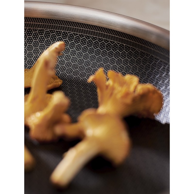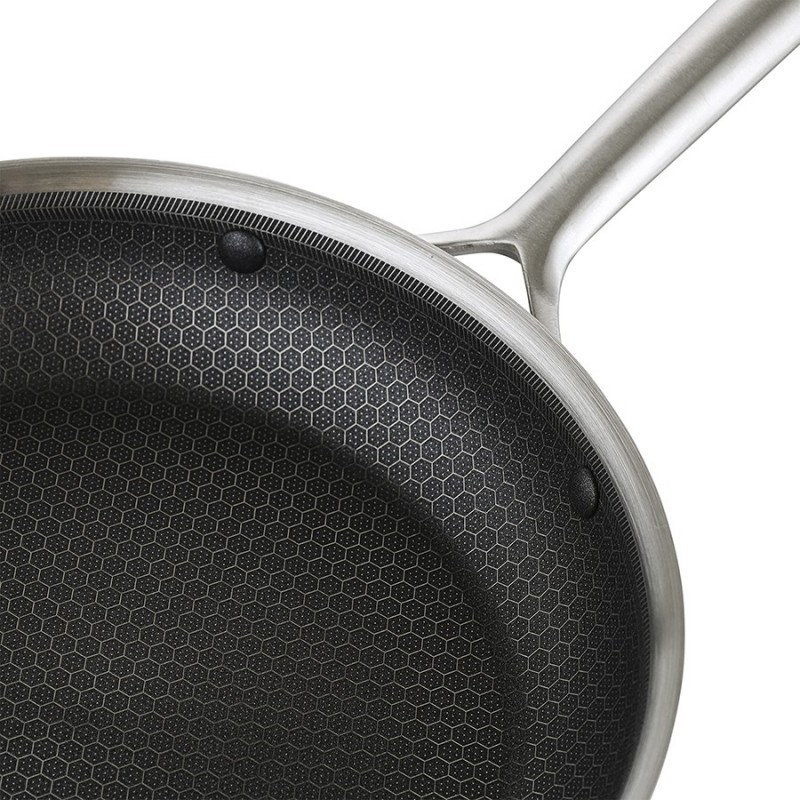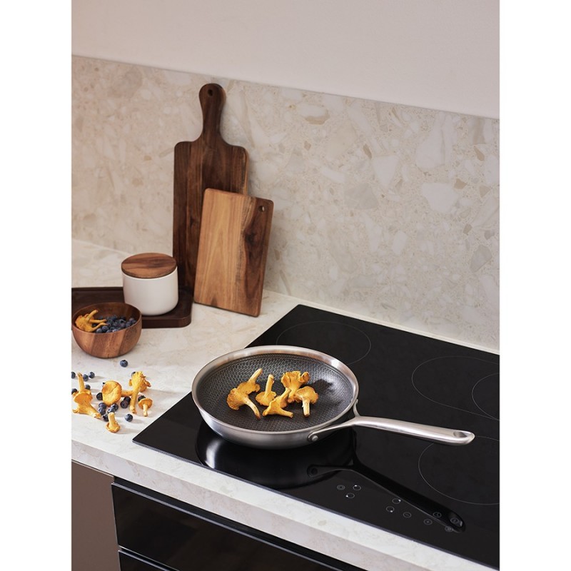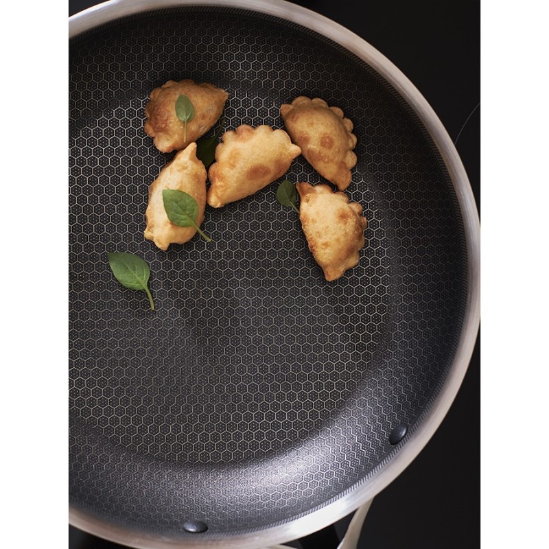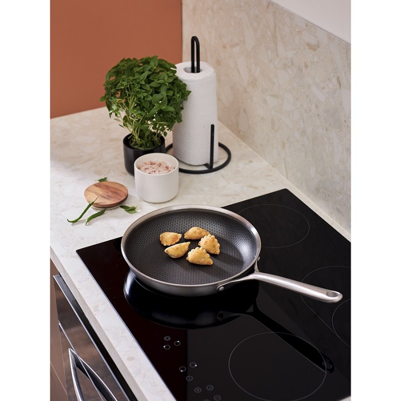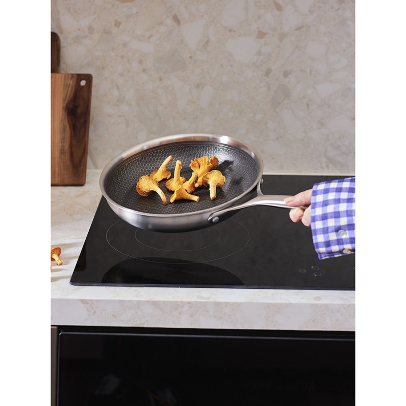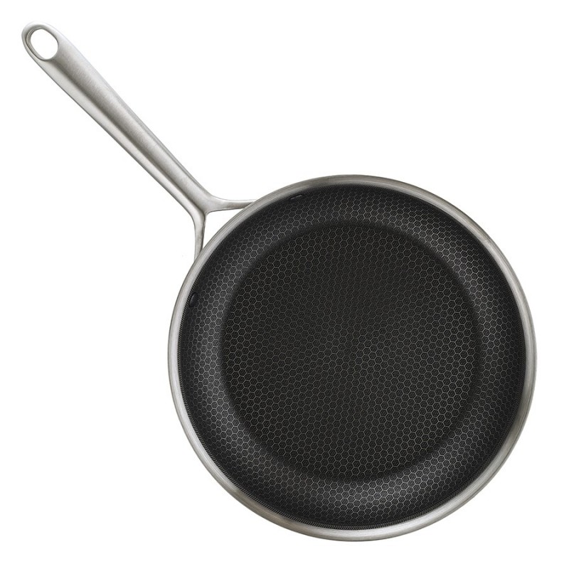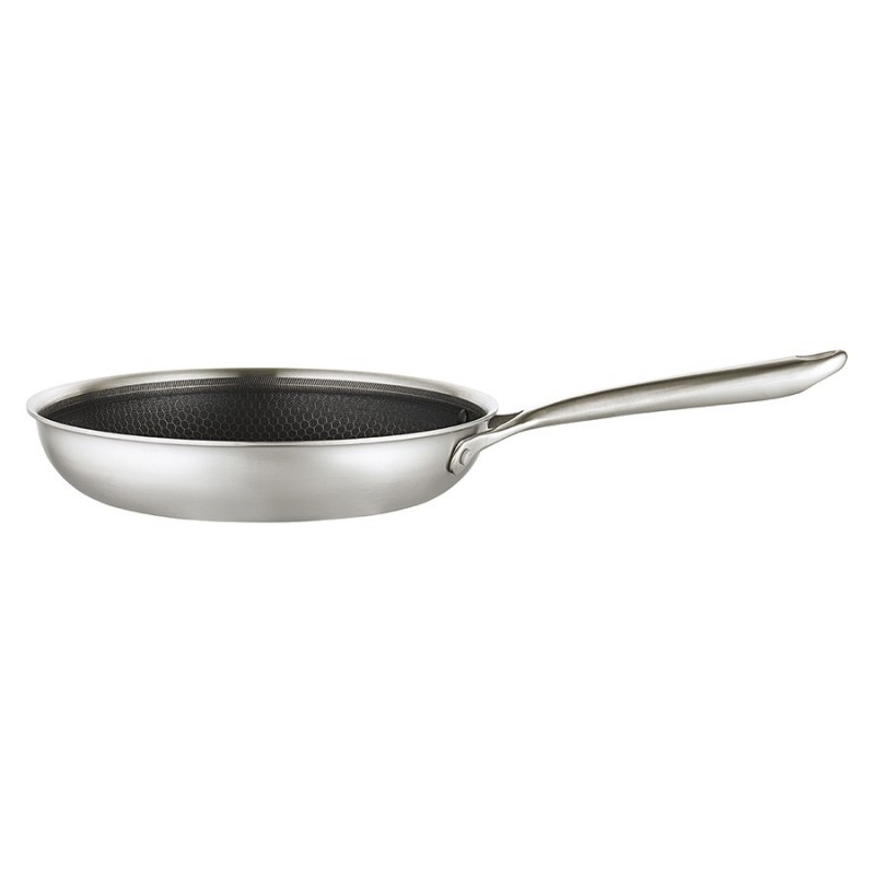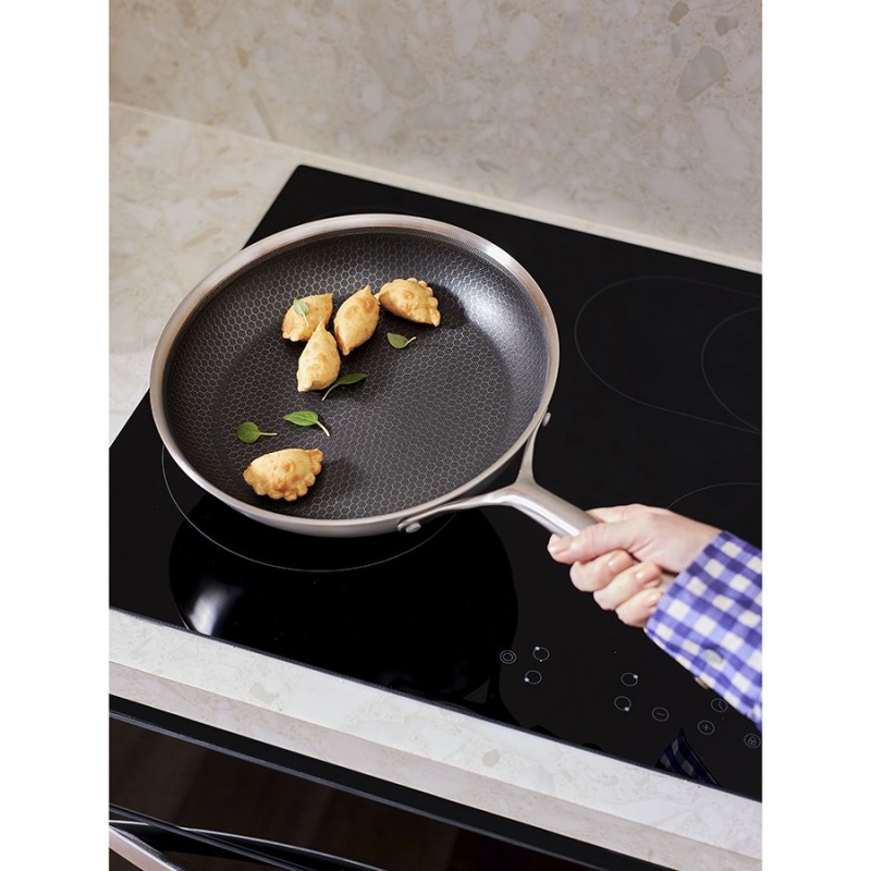 Сковорода 3Ply Etalon, изготовленная по инновационной технологии TRI-PLY, с уникальным структурным дном Honeycomb с лазерным напылением поможет получить настоящее удовольствие от готовки и позволит почувствовать себя настоящим шеф-поваром на собственной кухне.Особенности и преимущества:- Сковорода изготовлена из высококачественной нержавеющей стали 18/10, благодаря чему долго служит, сохраняя первозданный вид. - Дно и стенки из нержавеющей стали толщиной 2,5 мм с внутренним слоем из алюминия обеспечивают равномерное распределение тепла. - Посуда с толстым дном и стенками менее подвержена вмятинам и повреждениям. - Структурное дно Honeycomb с лазерным напылением устойчиво к царапинам и повреждениям, что позволяет использовать металлические кухонные инструменты. - Трехслойное покрытие Теflon Platinum не боится царапин, предотвращает прилипание продуктов, не выделяет вредных веществ и легко моется. - Устойчивая к нагреву ручка гарантирует безопасное и удобное использование. - Сковорода подходит для всех видов плит, включая индукционные, газовые и электрические. - Благодаря матовой поверхности посуда 3Ply Etalon выглядит невероятно стильно, что делает ее украшением любой современной кухни.! 3Ply Etalon с лазерным напылением по своим антипригарным свойствам отличается от сковородок с традиционным тефлоновым покрытием. Структурное дно Honeycomb предотвращает прилипание, но не полностью защищает от этого, поэтому рекомендуем хорошо разогревать сковороду перед жаркой и обязательно использовать небольшое количество масла. Некоторые “капризные” продукты, например, яичница, могут первое время требовать чуть больше внимания и контроля температуры. Зато блюда, приготовленные на этой сковороде, приобретают хрустящую корочку, которую сложнее получить на обычной антипригарной поверхности.Материал: нержавеющая сталь, алюминий, антипригарное покрытие Теflon Platinum. Диаметр по краю внешний: 27,7 см. Диаметр по краю внутренний: 26 см. Ширина: 27,6 см. Длина: 44,7 см. Высота: 5 см. Диаметр дна снаружи: 21 см. Диаметр дна изнутри: 21 см. Высота стенки изнутри: 5,5 см.Сковороду запрещено мыть в посудомоечной машине, только вручную. Перед первым использованием необходимо промыть сковороду в теплой мыльной воде при помощи мягкой губки. В дальнейшем рекомендуется очищать посуду сразу после приготовления, как только она остынет. Запрещается использование абразивов и агрессивной бытовой химии.