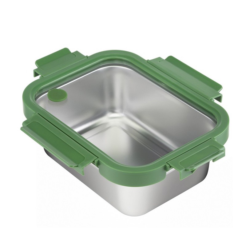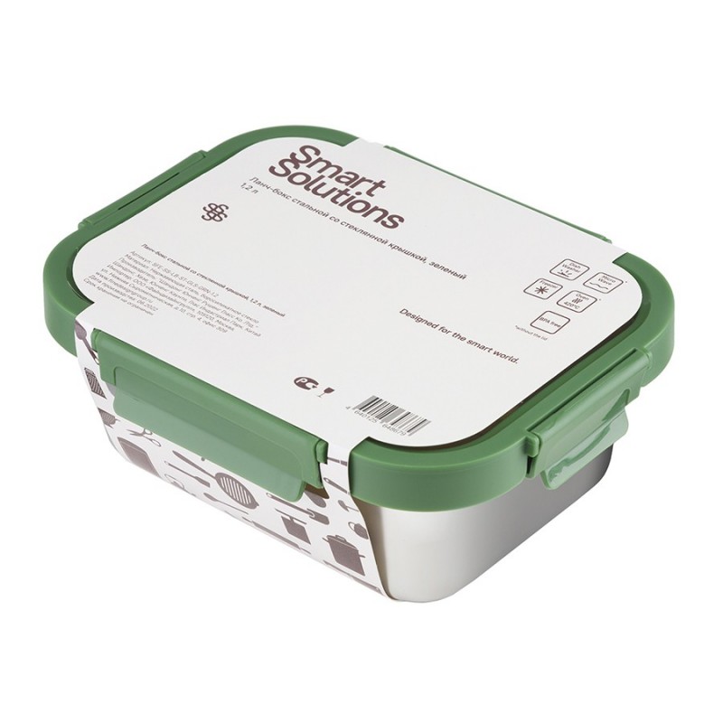 Ланч-бокс из нержавеющей стали – стильная, практичная и надежная посуда для хранения и переноски еды.Особенности и преимущества:- Емкость из нержавеющей стали типа 18/10 не боится коррозии, не впитывает запахи и загрязнения, долго сохраняет привлекательный вид. - Крышка из прочного боросиликатного стекла легко выдерживает перепады температуры, имеет специальные фиксаторы, которые помогают избежать протечек. - Наличие вентиляционного отверстия позволяет выпустить из контейнера лишний воздух или горячий пар, что повышает герметичность и улучшает условия хранения продуктов. - Благодаря компактным размерам ланч-бокс не занимает много места в сумке или рюкзаке.Материал: нержавеющая сталь 18/10, боросиликатное стекло, пластик. Размеры: 16х21х8 см. Объем: 1,2 л. Цвет: зеленый.Ланч-бокс можно мыть вручную и в посудомоечной машине (без крышки). Запрещается использование абразивов и агрессивной бытовой химии. Известковый налет с поверхности рекомендуется удалять при помощи раствора теплой воды с белым уксусом или пищевой содой, после чего контейнер требуется вытереть насухо. Для разогрева еды в микроволновке или духовке при температуре не более 420 °C необходимо снимать крышку, чтобы избежать деформации. Не допустим нагрев на открытом огне. Можно подвергать заморозке.
