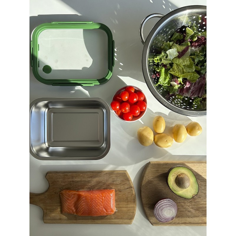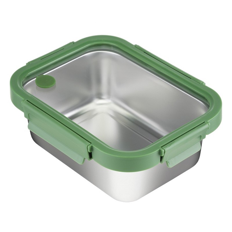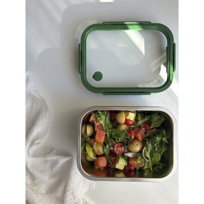 Ланч-бокс из нержавеющей стали – стильная, практичная и надежная посуда для хранения и переноски еды.Особенности и преимущества:- Емкость из нержавеющей стали типа 18/10 не боится коррозии, не впитывает запахи и загрязнения, долго сохраняет привлекательный вид. - Крышка из прочного боросиликатного стекла легко выдерживает перепады температуры, имеет специальные фиксаторы, которые помогают избежать протечек. - Наличие вентиляционного отверстия позволяет выпустить из контейнера лишний воздух или горячий пар, что повышает герметичность и улучшает условия хранения продуктов. - Благодаря компактным размерам ланч-бокс не занимает много места в сумке или рюкзаке.Материал: нержавеющая сталь 18/10, боросиликатное стекло, пластик. Размеры: 16х21х8 см. Объем: 1,2 л. Цвет: зеленый.Ланч-бокс можно мыть вручную и в посудомоечной машине (без крышки). Запрещается использование абразивов и агрессивной бытовой химии. Известковый налет с поверхности рекомендуется удалять при помощи раствора теплой воды с белым уксусом или пищевой содой, после чего контейнер требуется вытереть насухо. Для разогрева еды в микроволновке или духовке при температуре не более 420 °C необходимо снимать крышку, чтобы избежать деформации. Не допустим нагрев на открытом огне. Можно подвергать заморозке.