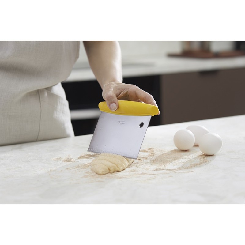 Шпатель-скребок Easy Cut – незаменимый инструмент для любителей выпечки и профессиональных кондитеров. Он станет настоящим помощником на кухне и идеально подойдет для замешивания, разрезания, распределения и формирования теста.Особенности и преимущества:- Рабочая часть скребка изготовлена из нержавеющей стали 430, известной своей прочностью и высокой устойчивостью к коррозии. - Ручка из термопластичной резины обеспечивает надежный хват, благодаря антискользящим свойствам материала. - Для удобства разделки теста на одинаковые кусочки шпатель оснащен размерной линейкой. - Заостренный край рабочей зоны шпателя позволяет легко разделять даже капризное, липкое тесто. - Наличие специального отверстия позволяет компактно хранить инструмент на настенном крючке. - Шпатель-скребок Easy Cut подходит для широкого спектра кондитерских задач – от выравнивания и разрезания теста, до создания уникальных декораций.Материалы: нержавеющая сталь 430, термопластичная резина. Размеры: 16,1х11,2х3,6 см.Можно мыть в посудомоечной машине на верхней полке. Запрещается использование абразивных материалов и агрессивной бытовой химии.