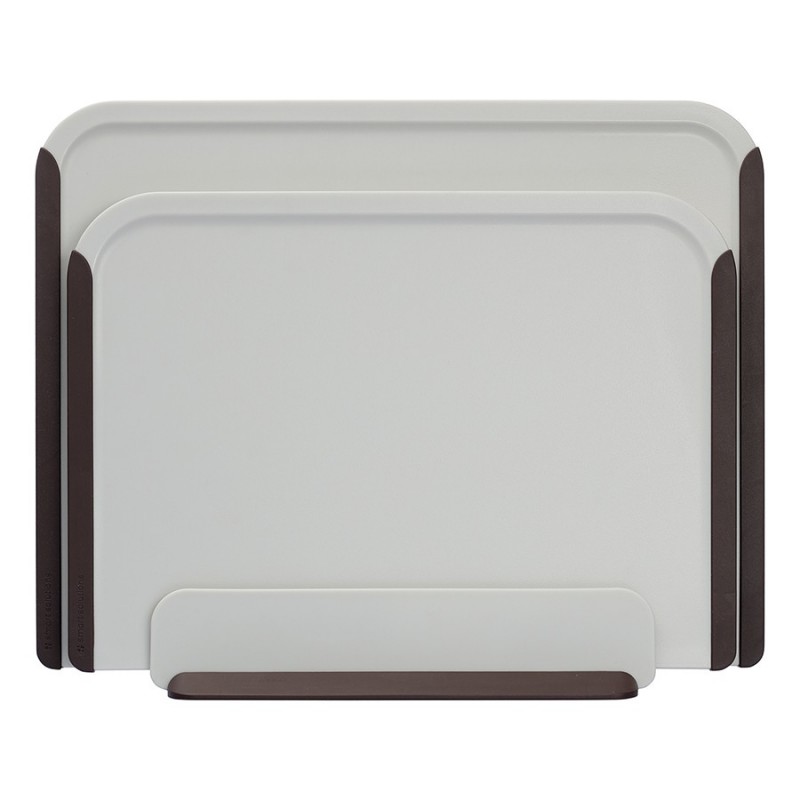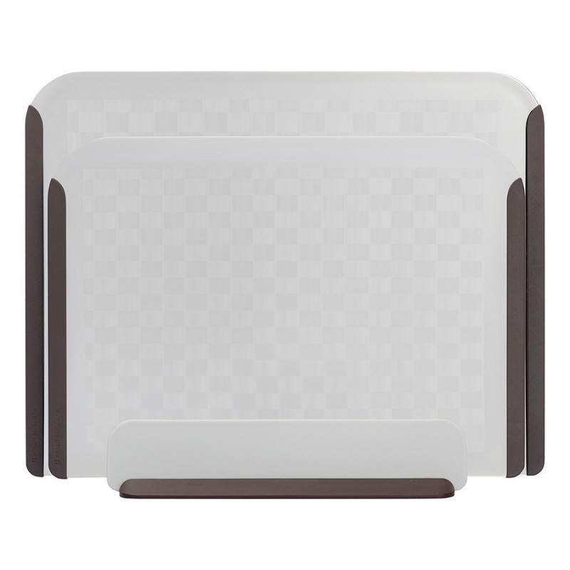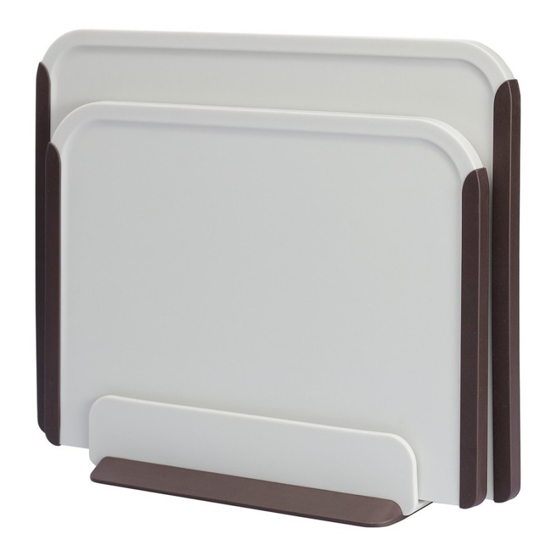 Набор SmartChef от дизайнерского бренда Smart Solutions включает в себя две разделочные доски различных размеров и специальную подставку для их удобного размещения.Особенности и преимущества:- Доски из полипропилена обладают прочностью, имеют небольшой вес, простые в уходе. - Благодаря резиновым вставкам аксессуары надежно фиксируются на столе и не скользят во время использования. - Вставки выполнены методом двухкомпонентного литья, поэтому составляют единое целое с досками. - Одна сторона досок имеет шероховатое покрытие для удобного нарезания продуктов, вторая – разметку для получения ровных кусочков. - Толщина досок составляет 10 мм, это делает их устойчивыми к деформации во время интенсивных задач, таких как отбивание мяса и прочих. - Поверхности с уклоном и специальные бортики задерживают жидкость внутри, не давая ей испачкать рабочую поверхность. - Специальная конструкция подставки позволяет надежно удерживать доски, давая им хорошо просохнуть, и хранить их как в вертикальном, так и в горизонтальном положении. - Благодаря компактным размерам подставка не занимает много места на столешнице.Коллекция кухонных инструментов SmartChef объединяет в себе лаконичный дизайн, высокую функциональность и инновационные материалы, чтобы приготовление блюд доставляло удовольствие, а пространство кухни выглядело стильным и организованным. Поверхности софт-тач дарят приятные тактильные ощущения и улучшают эргономику продуктов, делая их более удобными в использовании. Главное – все предметы специально разработаны для использования с посудой, имеющей антипригарное покрытие.Материалы: доски – полипропилен, термопластичная резина; подставка – нейлон, силикон. Размеры: доски – 40х31 см и 36х25 см; подставка – 27х8,5х5,5 см.Доски и подставку можно мыть вручную и в посудомоечной машине.