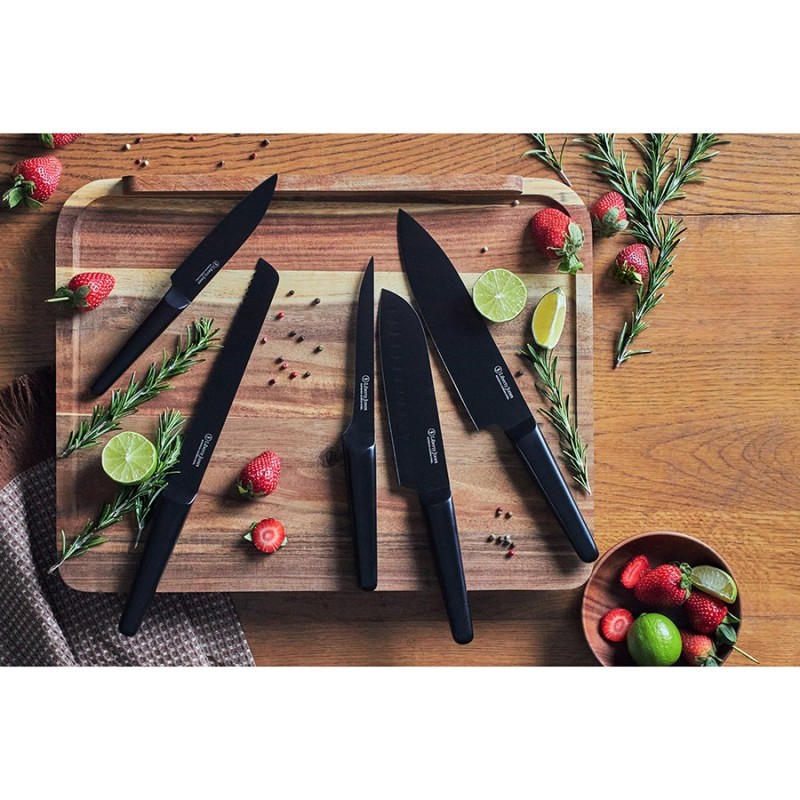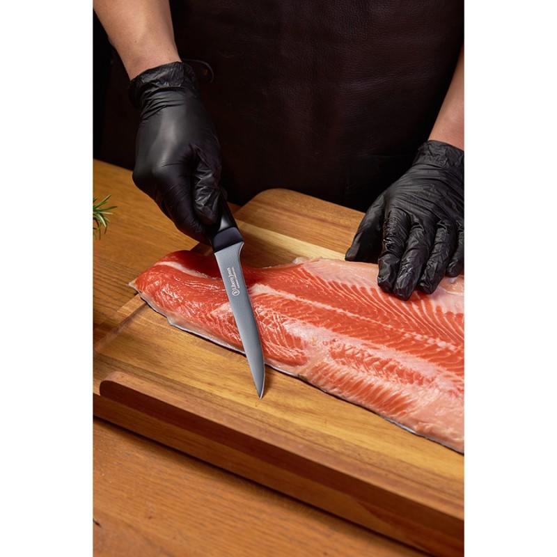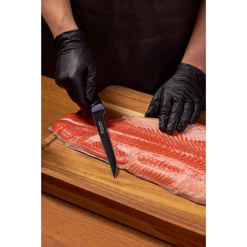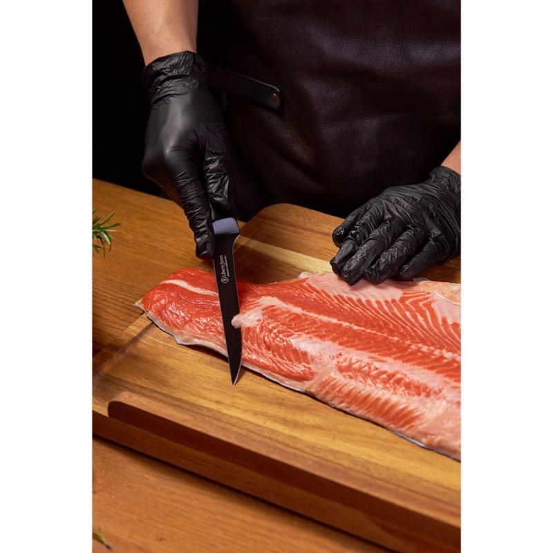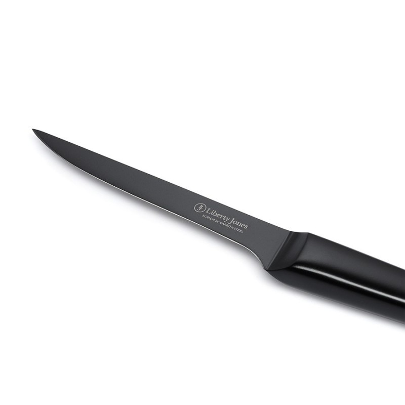 Нож филейный Carbon от бренда Liberty Jones – идеальный инструмент для разделки рыбы, мяса и птицы. Он легко справляется с такими задачами, как удаление кожи, отделение филе от костей и нарезка тонких ломтиков. Его лезвие из углеродистой стали обеспечивает легкость и точность каждого движения, делая процесс приготовления пищи быстрым и приятным.Особенности и преимущества:- Нож представляет собой цельную конструкцию, где лезвие плавно переходит в рукоятку. Это обеспечивает ему практичность и долговечность, исключая риск поломки в местах соединения. - Лезвие и рукоятка изготовлены из углеродистой стали 5Cr15Mov, известной своей прочностью, устойчивостью к высоким нагрузкам и коррозии. - В производстве используется технология лазерной заточки, что обеспечивает лезвию идеальную геометрию, максимальную остроту и исключает необходимость частой заточки. - Рукоятка кухонного инструмента имеет удобную форму и обеспечивает надежный хват, снижая риск порезов. - Покрытие черного цвета придает ножу современный и стильный вид. - При заточке ножа эмаль на лезвии незначительно стирается, что приводит к проявлению исходного цвета стали.Материал: углеродистая сталь 5Cr15Mov. Размеры: 1,9х28,5х2,8 см. Толщина лезвия: 0,2 мм. Длина клинка: 15,3 см. Угол заточки: 15-17°.Нож рекомендуется мыть вручную. Запрещается использование абразивных материалов и агрессивной бытовой химии.