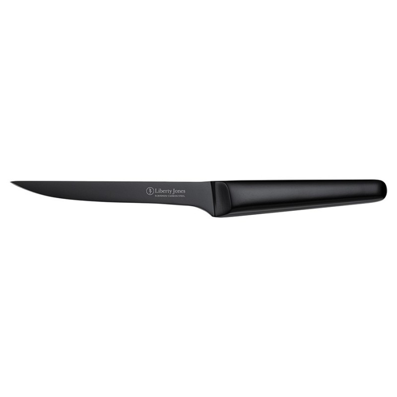Нож филейный Carbon от бренда Liberty Jones – идеальный инструмент для разделки рыбы, мяса и птицы. Он легко справляется с такими задачами, как удаление кожи, отделение филе от костей и нарезка тонких ломтиков. Его лезвие из углеродистой стали обеспечивает легкость и точность каждого движения, делая процесс приготовления пищи быстрым и приятным.Особенности и преимущества:- Нож представляет собой цельную конструкцию, где лезвие плавно переходит в рукоятку. Это обеспечивает ему практичность и долговечность, исключая риск поломки в местах соединения. - Лезвие и рукоятка изготовлены из углеродистой стали 5Cr15Mov, известной своей прочностью, устойчивостью к высоким нагрузкам и коррозии. - В производстве используется технология лазерной заточки, что обеспечивает лезвию идеальную геометрию, максимальную остроту и исключает необходимость частой заточки. - Рукоятка кухонного инструмента имеет удобную форму и обеспечивает надежный хват, снижая риск порезов. - Покрытие черного цвета придает ножу современный и стильный вид. - При заточке ножа эмаль на лезвии незначительно стирается, что приводит к проявлению исходного цвета стали.Материал: углеродистая сталь 5Cr15Mov. Размеры: 1,9х28,5х2,8 см. Толщина лезвия: 0,2 мм. Длина клинка: 15,3 см. Угол заточки: 15-17°.Нож рекомендуется мыть вручную. Запрещается использование абразивных материалов и агрессивной бытовой химии.