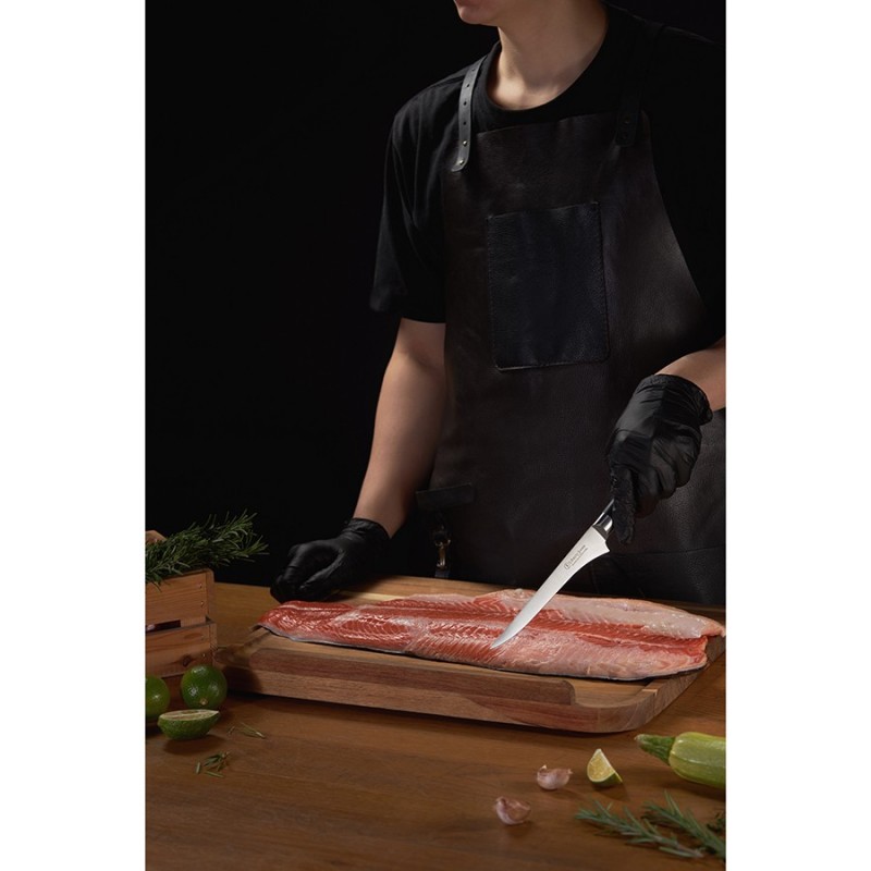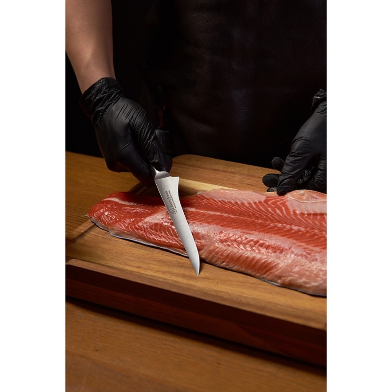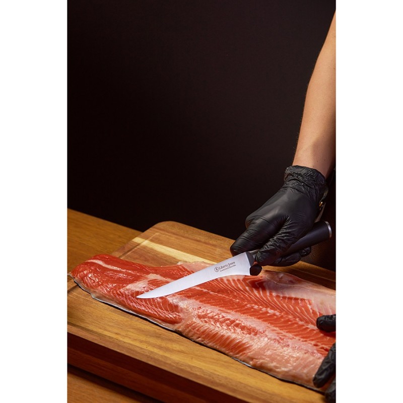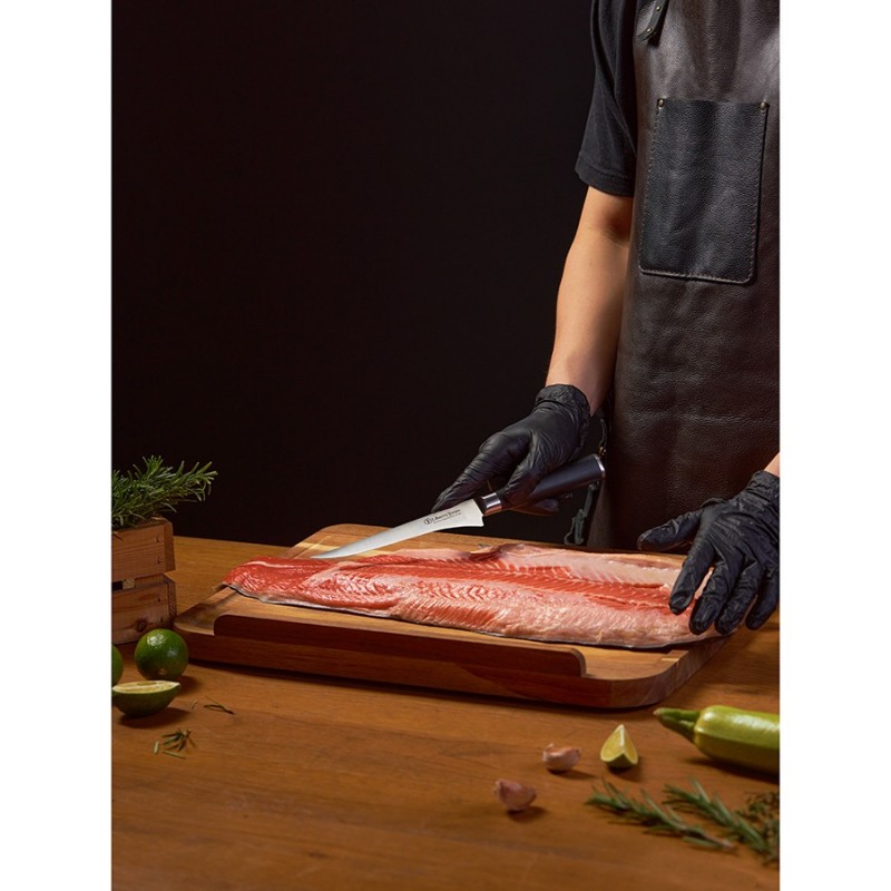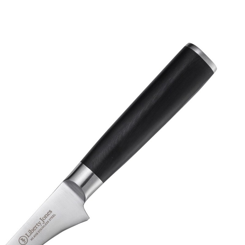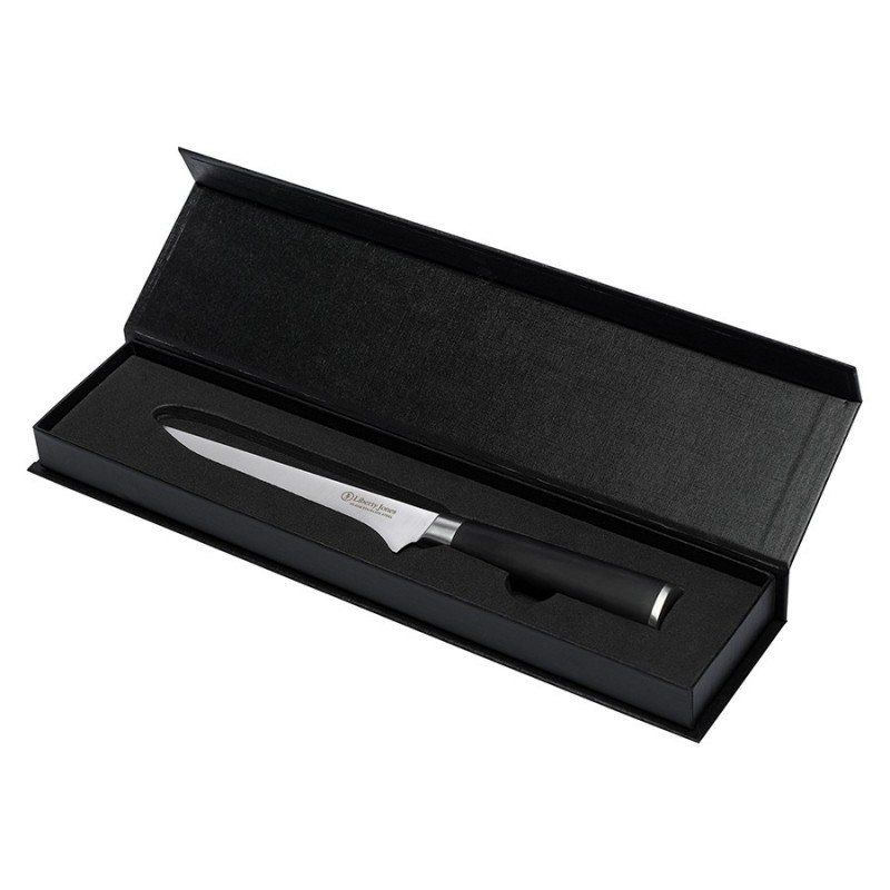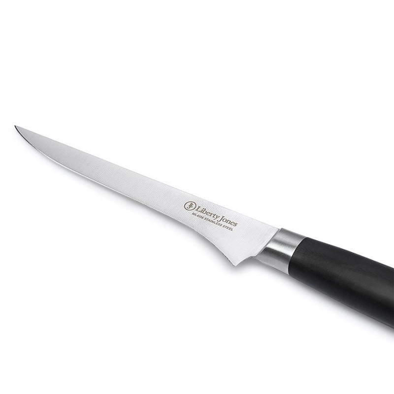 Филейный нож Icon от Liberty Jones – идеальный инструмент для разделки рыбы, мяса и птицы. Он легко справляется с такими задачами, как удаление кожи, отделение филе от костей и нарезка тонких ломтиков. Его лезвие из известной своими свойствами немецкой нержавеющей стали обеспечивает легкость и точность каждого движения, делая процесс приготовления пищи быстрым и приятным. Лазерные системы контролируют угол заточки с точностью до 0,1°, что невозможно при ручной или механической обработке. Кроме того, лазерная заточка не перегревает металл (в отличие от ручных методов), сохраняя структуру стали.Особенности и преимущества:- Рукоятка инструмента выполнена из ударопрочного, влагостойкого материала G-10, имеет эргономичную форму, обеспечивая надежный хват. - Лезвие из немецкой нержавеющей стали 1.4116 обладает высокой твердостью и устойчивостью к коррозии. - В производстве используется технология лазерной заточки, что обеспечивает лезвию идеальную геометрию, максимальную остроту и исключает необходимость частой заточки. - Лаконичный, современный дизайн делает нож Icon не только функциональным инструментом, но и украшением любой кухни.Материал: немецкая нержавеющая сталь 1.4116, композитный материал из стекловолокна G-10. Размеры: 3х28,8х2,9 см. Толщина лезвия: 0,2 мм. Длина клинка: 16,1 см. Угол заточки: 15-17°.Нож рекомендуется мыть вручную. Запрещается использование абразивных материалов и агрессивной бытовой химии.