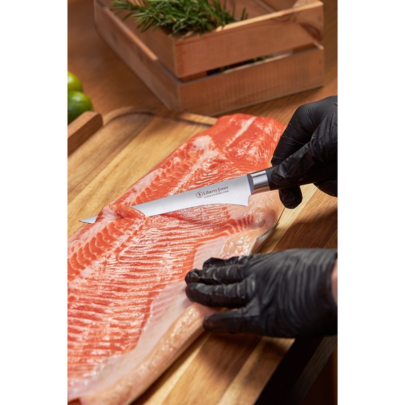 Филейный нож Icon от Liberty Jones – идеальный инструмент для разделки рыбы, мяса и птицы. Он легко справляется с такими задачами, как удаление кожи, отделение филе от костей и нарезка тонких ломтиков. Его лезвие из известной своими свойствами немецкой нержавеющей стали обеспечивает легкость и точность каждого движения, делая процесс приготовления пищи быстрым и приятным. Лазерные системы контролируют угол заточки с точностью до 0,1°, что невозможно при ручной или механической обработке. Кроме того, лазерная заточка не перегревает металл (в отличие от ручных методов), сохраняя структуру стали.Особенности и преимущества:- Рукоятка инструмента выполнена из ударопрочного, влагостойкого материала G-10, имеет эргономичную форму, обеспечивая надежный хват. - Лезвие из немецкой нержавеющей стали 1.4116 обладает высокой твердостью и устойчивостью к коррозии. - В производстве используется технология лазерной заточки, что обеспечивает лезвию идеальную геометрию, максимальную остроту и исключает необходимость частой заточки. - Лаконичный, современный дизайн делает нож Icon не только функциональным инструментом, но и украшением любой кухни.Материал: немецкая нержавеющая сталь 1.4116, композитный материал из стекловолокна G-10. Размеры: 3х28,8х2,9 см. Толщина лезвия: 0,2 мм. Длина клинка: 16,1 см. Угол заточки: 15-17°.Нож рекомендуется мыть вручную. Запрещается использование абразивных материалов и агрессивной бытовой химии.