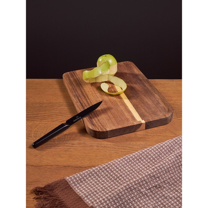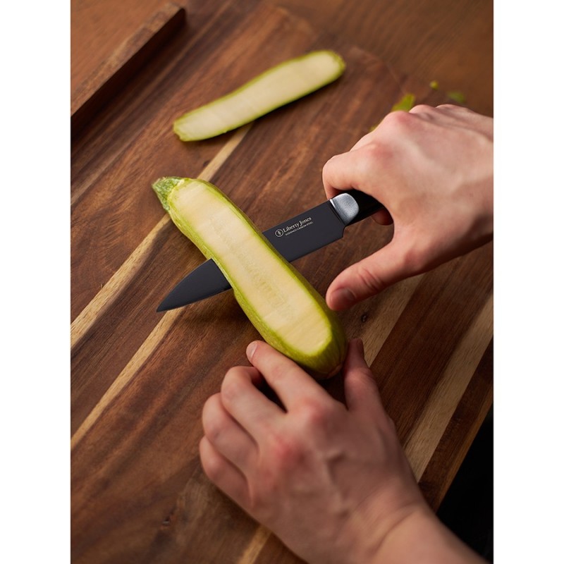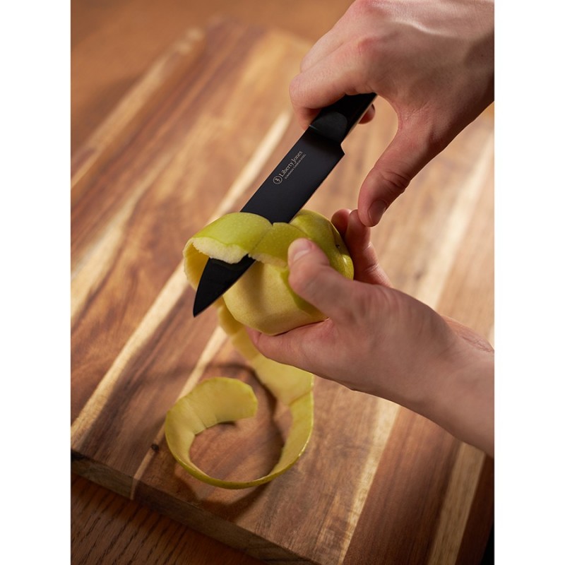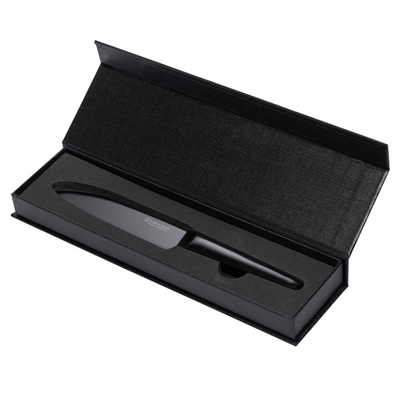 Разделочный нож Carbon от бренда Liberty Jones – многофункциональный кухонный инструмент, созданный для истинных ценителей качества и функциональности. Он идеально подходит для нарезки мяса, рыбы, овощей и фруктов. Благодаря прочной конструкции из углеродистой стали и эргономичному дизайну, этот нож станет надежным помощником на кухне, сделав каждую готовку легкой и приятной.Особенности и преимущества:- Нож представляет собой цельную конструкцию, где лезвие плавно переходит в рукоятку. Это обеспечивает ему практичность и долговечность, исключая риск поломки в местах соединения. - Лезвие и рукоятка изготовлены из углеродистой стали 5Cr15Mov, известной своей прочностью, устойчивостью к высоким нагрузкам и коррозии. - В производстве используется технология лазерной заточки, что обеспечивает лезвию идеальную геометрию, максимальную остроту и исключает необходимость частой заточки. - Рукоятка кухонного инструмента имеет удобную форму и обеспечивает надежный хват, снижая риск порезов. - Покрытие черного цвета придает ножу современный и стильный вид. - При заточке ножа эмаль на лезвии незначительно стирается, что приводит к проявлению исходного цвета стали.Материал: углеродистая сталь 5Cr15Mov. Размеры: 2,8х24,3х1,8 см. Толщина лезвия: 0,2 мм. Длина клинка: 13,2 см. Угол заточки: 15-17°.Нож рекомендуется мыть вручную. Запрещается использование абразивных материалов и агрессивной бытовой химии.