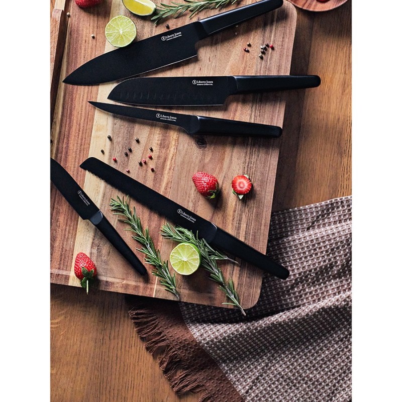 Разделочный нож Carbon от бренда Liberty Jones – многофункциональный кухонный инструмент, созданный для истинных ценителей качества и функциональности. Он идеально подходит для нарезки мяса, рыбы, овощей и фруктов. Благодаря прочной конструкции из углеродистой стали и эргономичному дизайну, этот нож станет надежным помощником на кухне, сделав каждую готовку легкой и приятной.Особенности и преимущества:- Нож представляет собой цельную конструкцию, где лезвие плавно переходит в рукоятку. Это обеспечивает ему практичность и долговечность, исключая риск поломки в местах соединения. - Лезвие и рукоятка изготовлены из углеродистой стали 5Cr15Mov, известной своей прочностью, устойчивостью к высоким нагрузкам и коррозии. - В производстве используется технология лазерной заточки, что обеспечивает лезвию идеальную геометрию, максимальную остроту и исключает необходимость частой заточки. - Рукоятка кухонного инструмента имеет удобную форму и обеспечивает надежный хват, снижая риск порезов. - Покрытие черного цвета придает ножу современный и стильный вид. - При заточке ножа эмаль на лезвии незначительно стирается, что приводит к проявлению исходного цвета стали.Материал: углеродистая сталь 5Cr15Mov. Размеры: 2,8х24,3х1,8 см. Толщина лезвия: 0,2 мм. Длина клинка: 13,2 см. Угол заточки: 15-17°.Нож рекомендуется мыть вручную. Запрещается использование абразивных материалов и агрессивной бытовой химии.