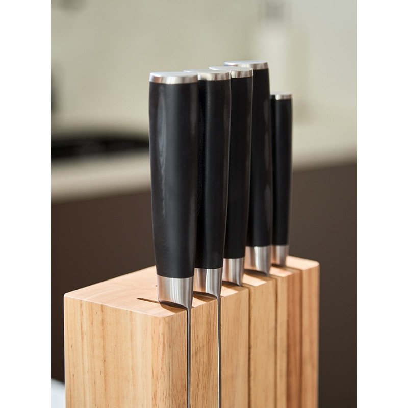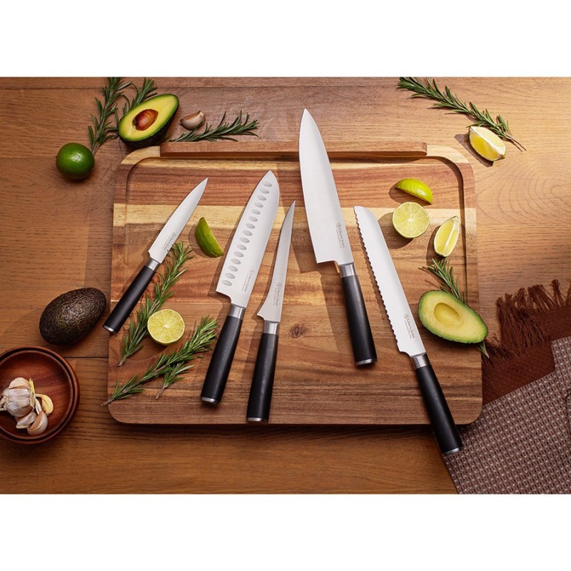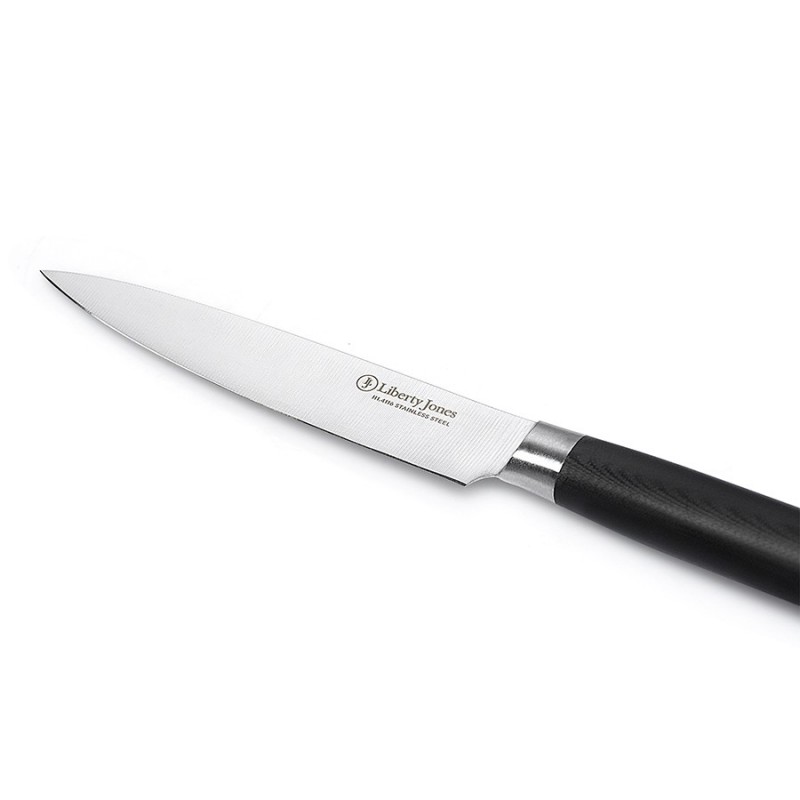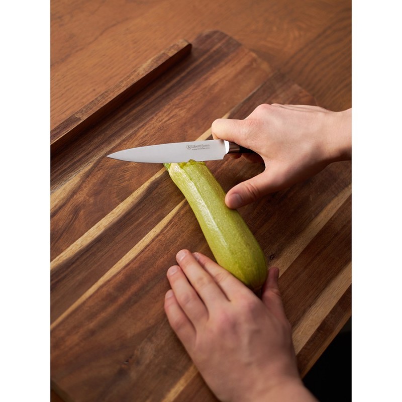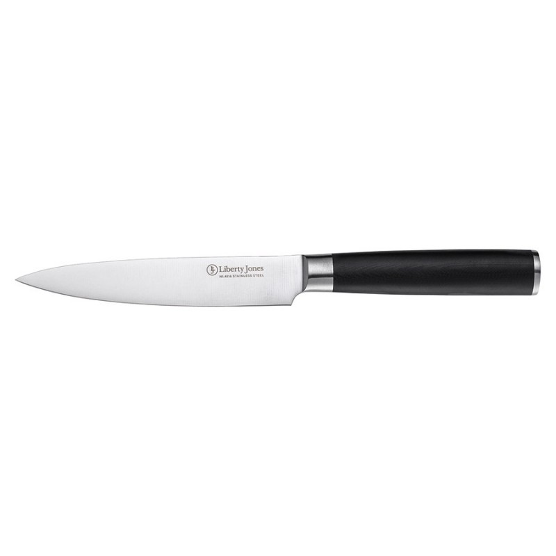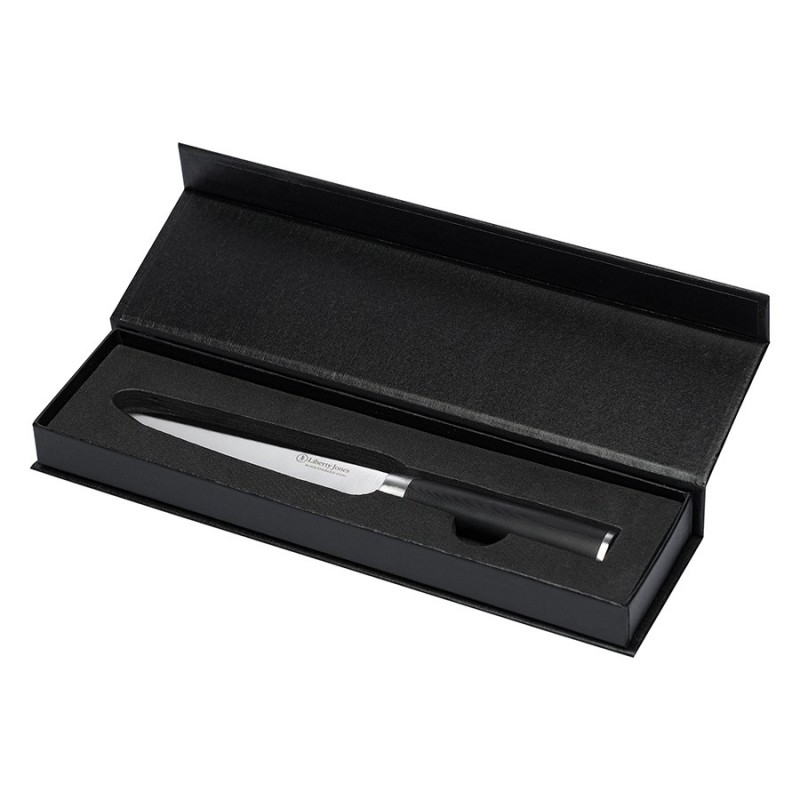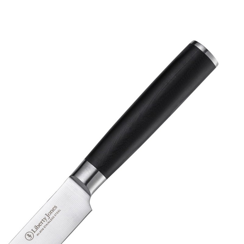 Разделочный нож Icon от бренда Liberty Jones – многофункциональный кухонный инструмент из немецкой нержавеющей стали, созданный для истинных ценителей качества и функциональности. Он идеально подходит для нарезки мяса, рыбы, овощей и фруктов, обеспечивая надежность и удобство использования. Лазерные системы контролируют угол заточки с точностью до 0,1°, что невозможно при ручной или механической обработке. Кроме того, лазерная заточка не перегревает металл (в отличие от ручных методов), сохраняя структуру стали.Особенности и преимущества:- Рукоятка инструмента выполнена из ударопрочного, влагостойкого материала G-10, имеет эргономичную форму, обеспечивая надежный хват. - Лезвие из немецкой нержавеющей стали 1.4116 обладает высокой твердостью и устойчивостью к коррозии. - В производстве используется технология лазерной заточки, что обеспечивает лезвию идеальную геометрию, максимальную остроту и исключает необходимость частой заточки. - Лаконичный, современный дизайн делает нож Icon не только функциональным инструментом, но и украшением любой кухни.Материал: немецкая нержавеющая сталь 1.4116, композитный материал из стекловолокна G-10. Размеры: 2,8х24,3х1,8 см. Толщина лезвия: 0,3 мм. Длина клинка: 12,6 см. Угол заточки: 15-17°.Нож рекомендуется мыть вручную. Запрещается использование абразивных материалов и агрессивной бытовой химии.