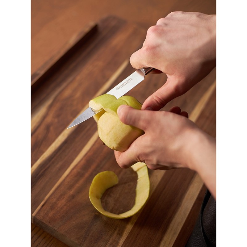 Разделочный нож Icon от бренда Liberty Jones – многофункциональный кухонный инструмент из немецкой нержавеющей стали, созданный для истинных ценителей качества и функциональности. Он идеально подходит для нарезки мяса, рыбы, овощей и фруктов, обеспечивая надежность и удобство использования. Лазерные системы контролируют угол заточки с точностью до 0,1°, что невозможно при ручной или механической обработке. Кроме того, лазерная заточка не перегревает металл (в отличие от ручных методов), сохраняя структуру стали.Особенности и преимущества:- Рукоятка инструмента выполнена из ударопрочного, влагостойкого материала G-10, имеет эргономичную форму, обеспечивая надежный хват. - Лезвие из немецкой нержавеющей стали 1.4116 обладает высокой твердостью и устойчивостью к коррозии. - В производстве используется технология лазерной заточки, что обеспечивает лезвию идеальную геометрию, максимальную остроту и исключает необходимость частой заточки. - Лаконичный, современный дизайн делает нож Icon не только функциональным инструментом, но и украшением любой кухни.Материал: немецкая нержавеющая сталь 1.4116, композитный материал из стекловолокна G-10. Размеры: 2,8х24,3х1,8 см. Толщина лезвия: 0,3 мм. Длина клинка: 12,6 см. Угол заточки: 15-17°.Нож рекомендуется мыть вручную. Запрещается использование абразивных материалов и агрессивной бытовой химии.