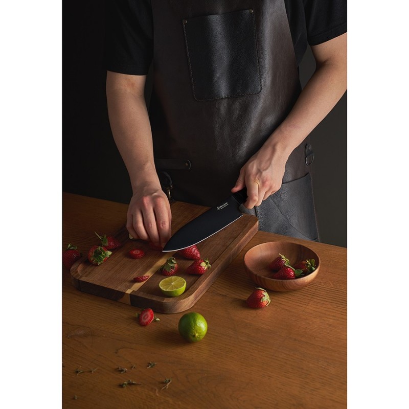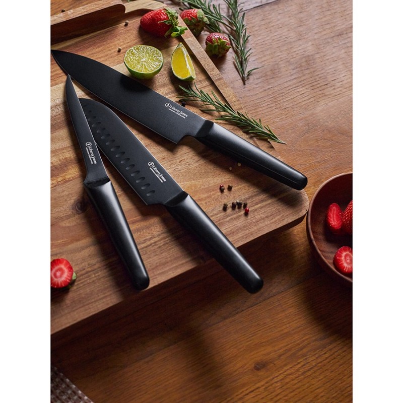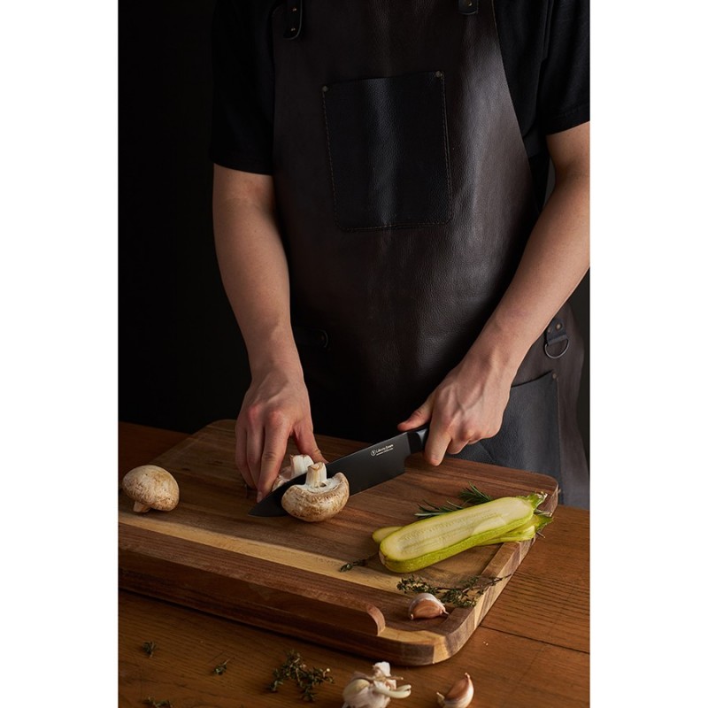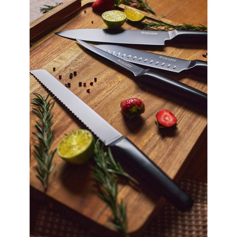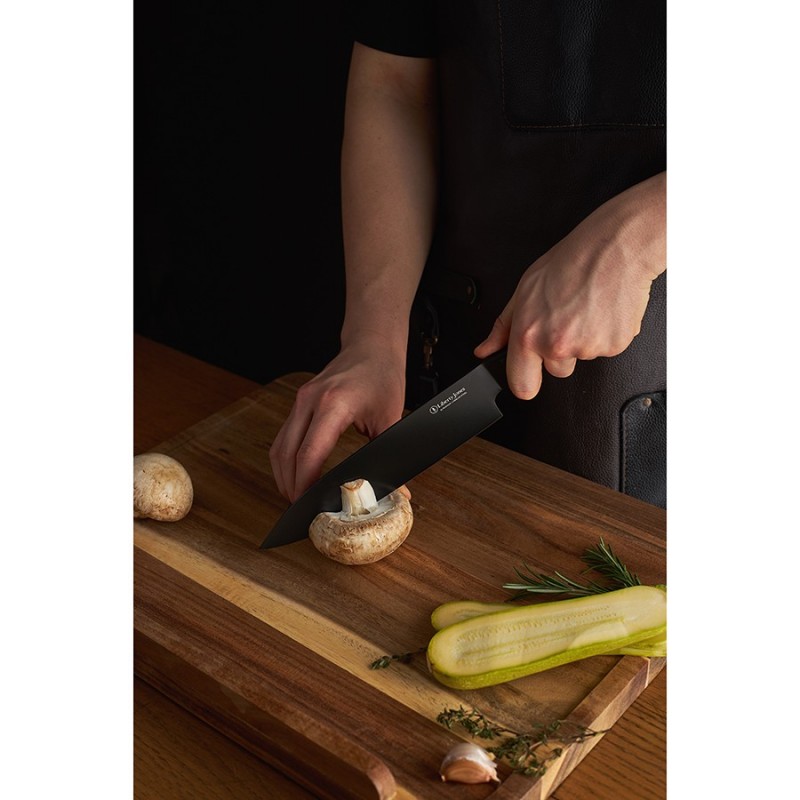 Шеф-нож Carbon от бренда Liberty Jones – универсальный инструмент, который идеально подходит для большинства кулинарных задач: очистка, рубка, измельчение, шинковка самых разных продуктов. Добавьте его в свою коллекцию кухонных принадлежностей и превратите каждое приготовление пищи в настоящее удовольствие.Особенности и преимущества:- Нож представляет собой цельную конструкцию, где лезвие плавно переходит в рукоятку. Это обеспечивает ему практичность и долговечность, исключая риск поломки в местах соединения. - Лезвие и рукоятка изготовлены из углеродистой стали 5Cr15Mov, известной своей прочностью, устойчивостью к высоким нагрузкам и коррозии. - В производстве используется технология лазерной заточки, что обеспечивает лезвию идеальную геометрию, максимальную остроту и исключает необходимость частой заточки. - Длина лезвия 20 см делает этот нож идеальным для выполнения разнообразных задач. - Рукоятка кухонного инструмента имеет удобную форму и обеспечивает надежный хват, снижая риск порезов. - При заточке ножа эмаль на лезвии незначительно стирается, что приводит к проявлению исходного цвета стали.Материал: углеродистая сталь 5Cr15Mov. Размеры: 4,6х34,2х1,9 см. Толщина лезвия: 0,3 мм. Длина клинка: 20,8 см. Угол заточки: 15-17°.Нож рекомендуется мыть вручную. Запрещается использование абразивных материалов и агрессивной бытовой химии.