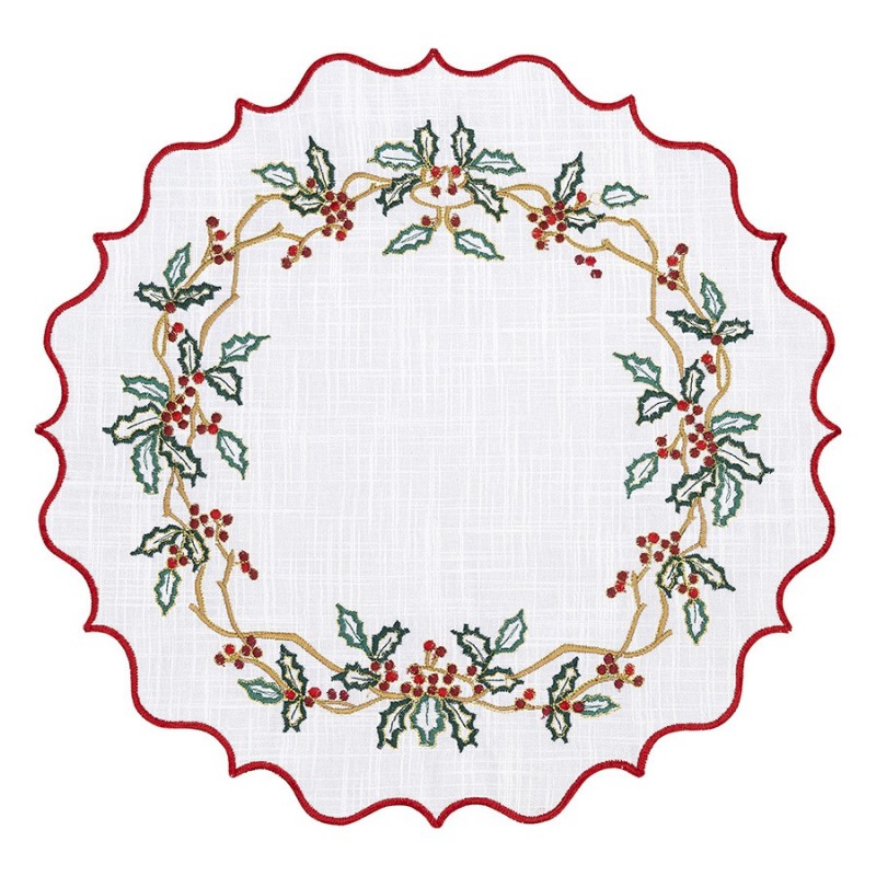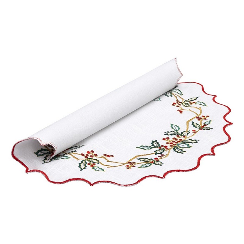 Салфетки под приборы Festive wreath из коллекции New Year Essential помогут сделать акцент на деталях сервировки и создать особую атмосферу за столом. Вышивка в виде хвойных веточек и ягод воплощает символику праздника, напоминая о новогоднем волшебстве, подарках и уютных вечерах в кругу семьи и друзей.Особенности и преимущества:- Салфетки выполнены из экологичного, прочного и долговечного 100% хлопка. - Материал выдерживает многократные стирки, сохраняя цвет и первоначальное качество. - Ручная вышивка придает изделию особую ценность, делает дизайн уникальным.Материал: 100% хлопок. Плотность: 160 г/м2. Диаметр: 38 см.! Стирка запрещена ! Гладить запрещено ! Барабанная сушка запрещена ! Не отбеливать ! Сухая чистка запрещена ! Допускается ручная чистка пятен