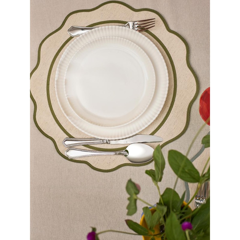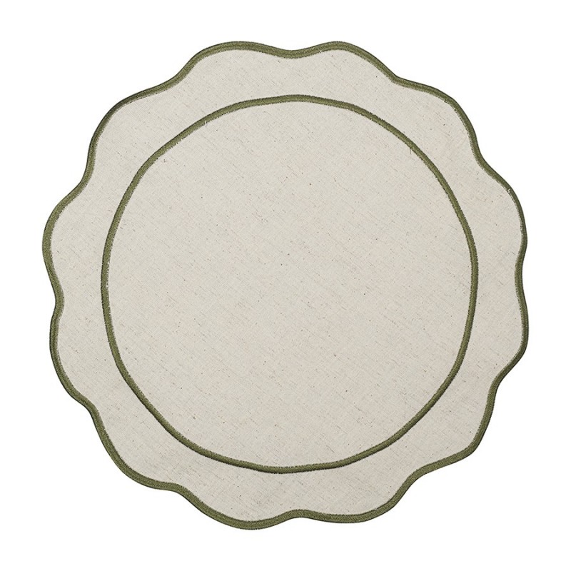Салфетка под приборы Anemone из коллекции Trendy Ruffles с кантом оливкового цвета сделает любую сервировку стильной, позволив экспериментировать с текстурами и формами. Текстиль с волнистой отделкой, напоминающей изящные раковины морских гребешков, стал ярким элементом стиля Ар Деко – и сейчас возвращается в моду, появляясь в самых актуальных интерьерных решениях.Особенности и преимущества:- Выполнена из экологичных и долговечных материалов – смеси хлопка и льна. - Имеет трендовый дизайн, что позволяет использовать ее в качестве акцента. - Выдерживает многократные стирки, сохраняя привлекательный вид.Материалы: 90% хлопок, 10% лён. Диаметр: 38 см.! Деликатная стирка при температуре 30° C ! Гладить при максимальной температуре 110° C ! Сушить в тени (без попадания прямых солнечных лучей) ! Не отбеливать ! Сухая чистка запрещена