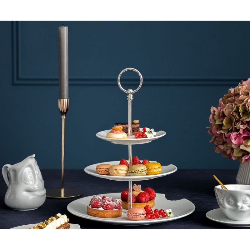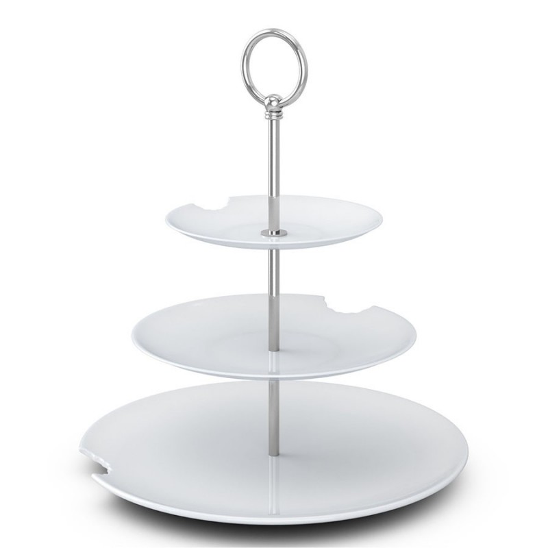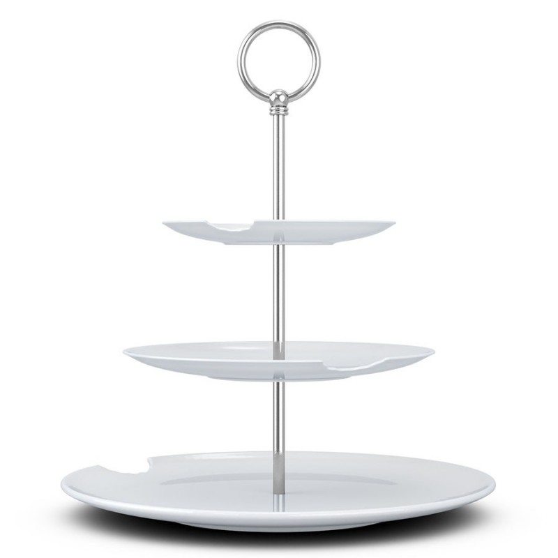 Этажерка Food-Tempel отлично подходит для подачи сладостей и фруктов. На трех ярусах достаточно места, чтобы разложить много лакомств для торжественного застолья или угощение на каждый день. Посуда с таким дизайном обязательно поднимет настроение и органично впишется практически в любую в сервировку стола.Особенности и преимущества:- Высококачественный фарфор не разрушается и не желтеет, а нержавеющая сталь не тускнеет со временем. - За гладкой поверхностью всех элементов этажерки легко ухаживать. - Благодаря эффектному дизайну подходит для оформления помещений в современном и классическом стиле. - Для хранения или тщательного мытья тарелки и стержень легко разъединить, а потом заново собрать в прочную конструкцию. - Поставляется в красивой подарочной коробке.Материалы: фарфор, нержавеющая сталь. Размеры: высота – 32 см, диаметр верхней тарелки – 15 см, средней – 20 см, нижней – 28 см. Цвет тарелок – белые, стержень – серебристый.В посудомоечной машине можно мыть только тарелки, стержень рекомендовано мыть вручную с жидким моющим средством. Запрещено использовать абразивные составы и щетки с жесткой щетиной.