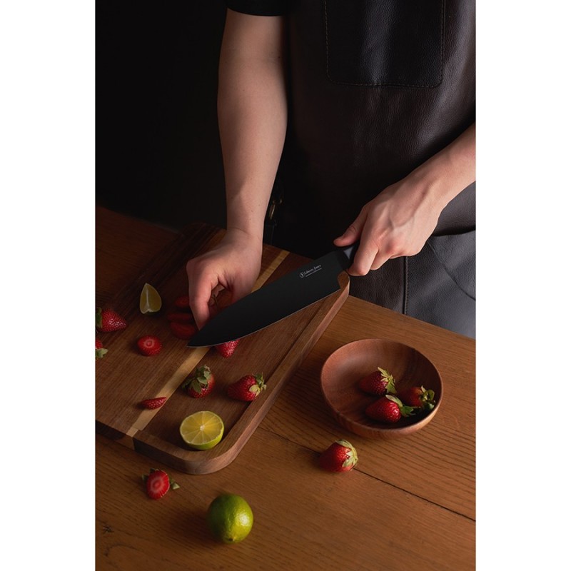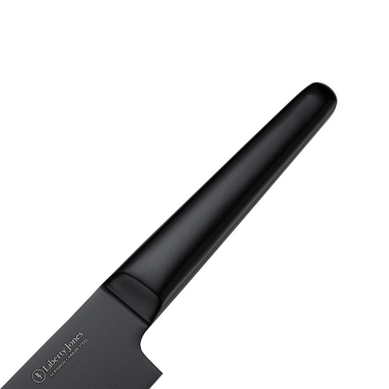 Шеф-нож Carbon от бренда Liberty Jones – универсальный инструмент, который идеально подходит для большинства кулинарных задач: очистка, рубка, измельчение, шинковка самых разных продуктов. Добавьте его в свою коллекцию кухонных принадлежностей и превратите каждое приготовление пищи в настоящее удовольствие.Особенности и преимущества:- Нож представляет собой цельную конструкцию, где лезвие плавно переходит в рукоятку. Это обеспечивает ему практичность и долговечность, исключая риск поломки в местах соединения. - Лезвие и рукоятка изготовлены из углеродистой стали 5Cr15Mov, известной своей прочностью, устойчивостью к высоким нагрузкам и коррозии. - В производстве используется технология лазерной заточки, что обеспечивает лезвию идеальную геометрию, максимальную остроту и исключает необходимость частой заточки. - Длина лезвия 20 см делает этот нож идеальным для выполнения разнообразных задач. - Рукоятка кухонного инструмента имеет удобную форму и обеспечивает надежный хват, снижая риск порезов. - При заточке ножа эмаль на лезвии незначительно стирается, что приводит к проявлению исходного цвета стали.Материал: углеродистая сталь 5Cr15Mov. Размеры: 4,6х34,2х1,9 см. Толщина лезвия: 0,3 мм. Длина клинка: 20,8 см. Угол заточки: 15-17°.Нож рекомендуется мыть вручную. Запрещается использование абразивных материалов и агрессивной бытовой химии.