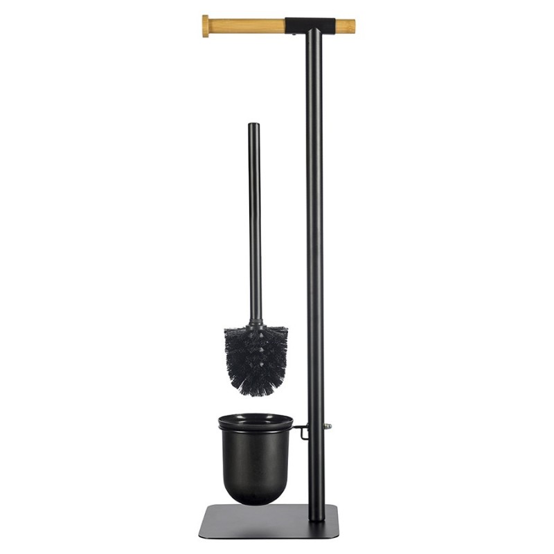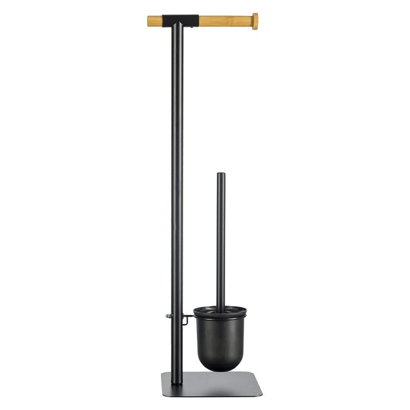 Держатель для туалетной бумаги с ершиком Mats от бренда Bergenson Bjorn представляет собой стильную и продуманную до мелочей конструкцию, которая прекрасно впишется в интерьер любого современного санузла. Сочетание элементов из железа и бамбука обеспечивает напольному аксессуару практичность, долговечность и интересный вид. Щетка с изогнутой рукояткой удобно сидит в руке и позволяет качественно очищать унитаз в труднодоступных местах. Внутренний контейнер из пластика защищает металлический корпус от прямого контакта с водой и загрязнениями, легко моется. За счет минималистичного дизайна и классического цветового решения модель отлично сочетается с различными вариантами оформления помещения.Материал: железо, бамбук. Размеры: 20,5х18х67 см. Цвет: черный.Пыль и загрязнения рекомендуется удалять при помощи мягкого влажного материала.