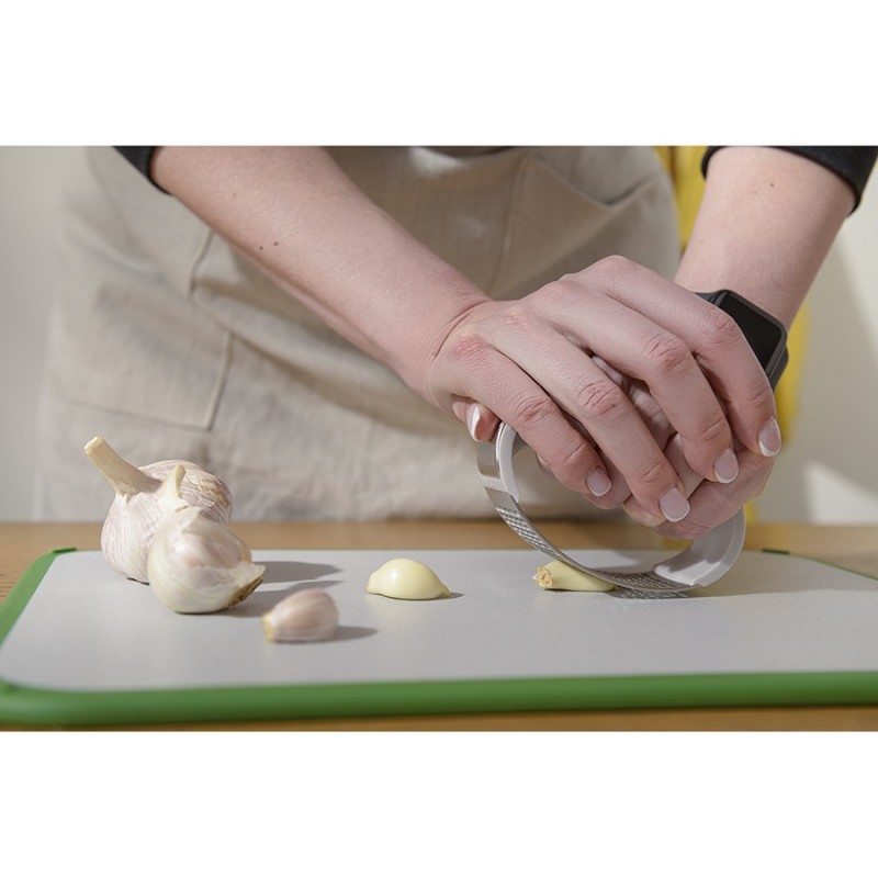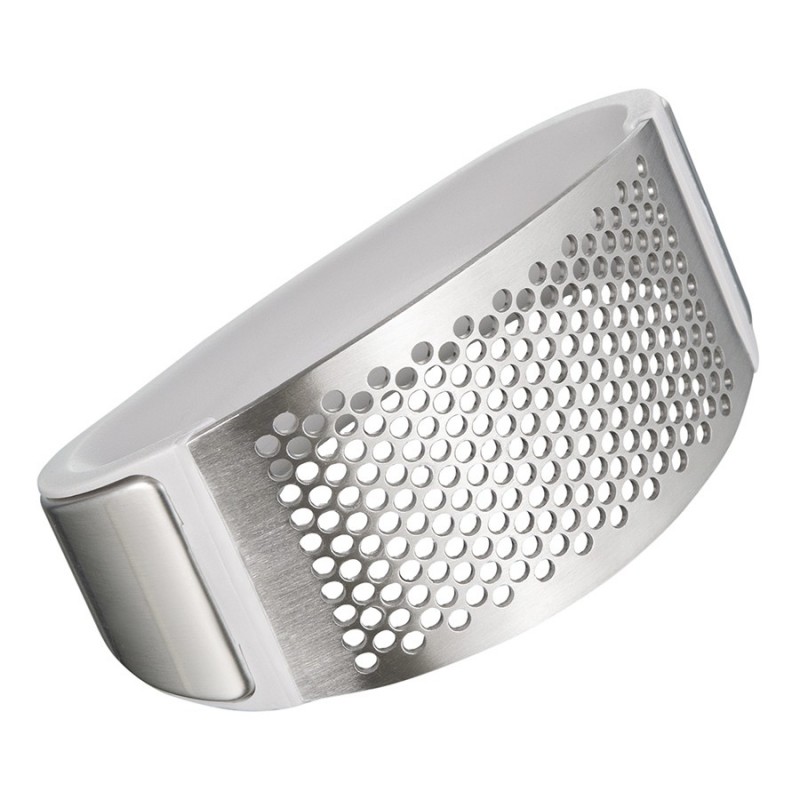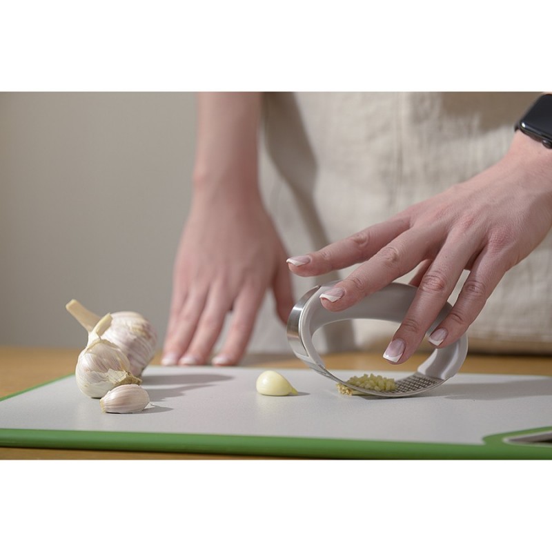 Пресс Vegard представляет собой специальное устройство для измельчения зубчиков чеснока путем продавливания через мелкую сетку.Особенности и преимущества:- Эргономичная ручка из пластика обеспечивает удобный захват. - Рабочая поверхность из нержавеющей стали 304 устойчива к повреждениям, износу и коррозии. - Специальные стальные вставки позволяют удалить едкий запах чеснока – просто потрите ими руки, поместив их под проточную воду. - Компактный аксессуар с легкостью помещается в ящик стола и органайзер для кухонных принадлежностей.Материалы: полипропилен, нержавеющая сталь 304. Размеры: 10,7x5,1x6,9 см. Цвет: светло-серый.Можно мыть вручную и в посудомоечной машине.