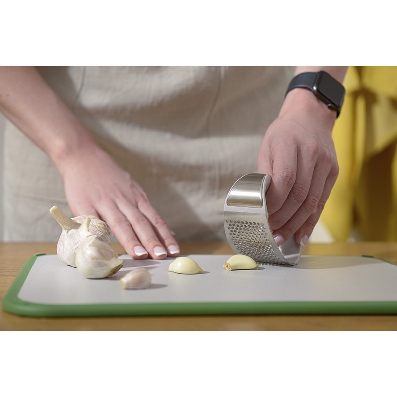 Пресс Vegard представляет собой специальное устройство для измельчения зубчиков чеснока путем продавливания через мелкую сетку.Особенности и преимущества:- Эргономичная ручка из пластика обеспечивает удобный захват. - Рабочая поверхность из нержавеющей стали 304 устойчива к повреждениям, износу и коррозии. - Специальные стальные вставки позволяют удалить едкий запах чеснока – просто потрите ими руки, поместив их под проточную воду. - Компактный аксессуар с легкостью помещается в ящик стола и органайзер для кухонных принадлежностей.Материалы: полипропилен, нержавеющая сталь 304. Размеры: 10,7x5,1x6,9 см. Цвет: светло-серый.Можно мыть вручную и в посудомоечной машине.