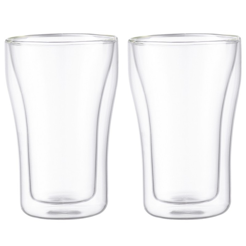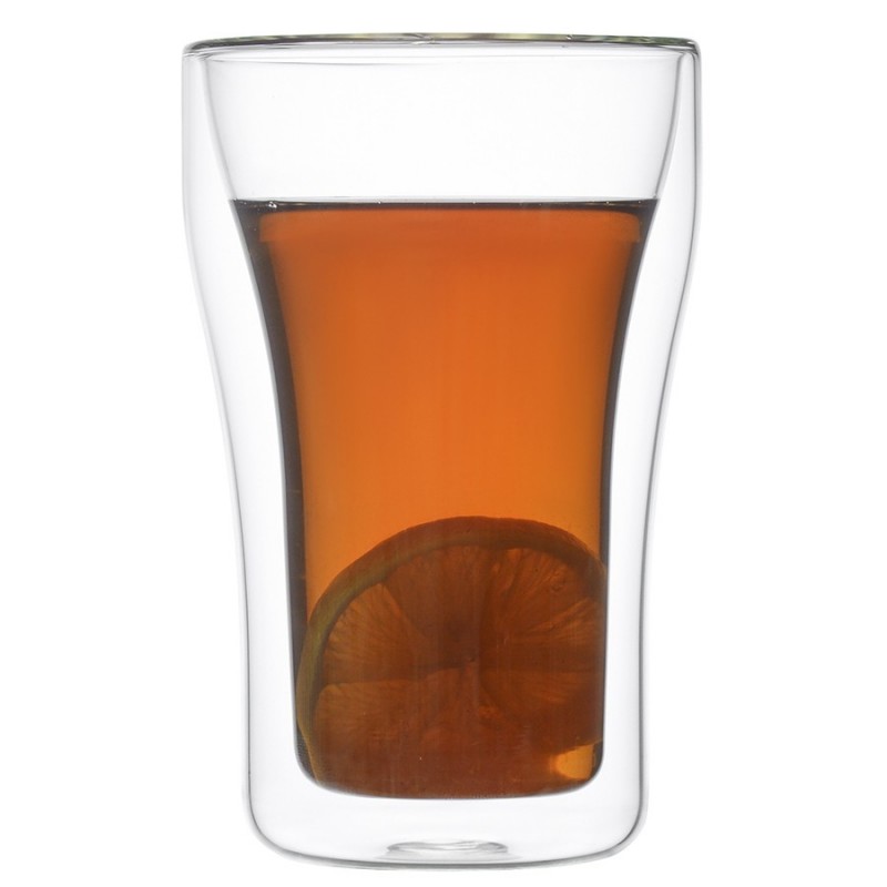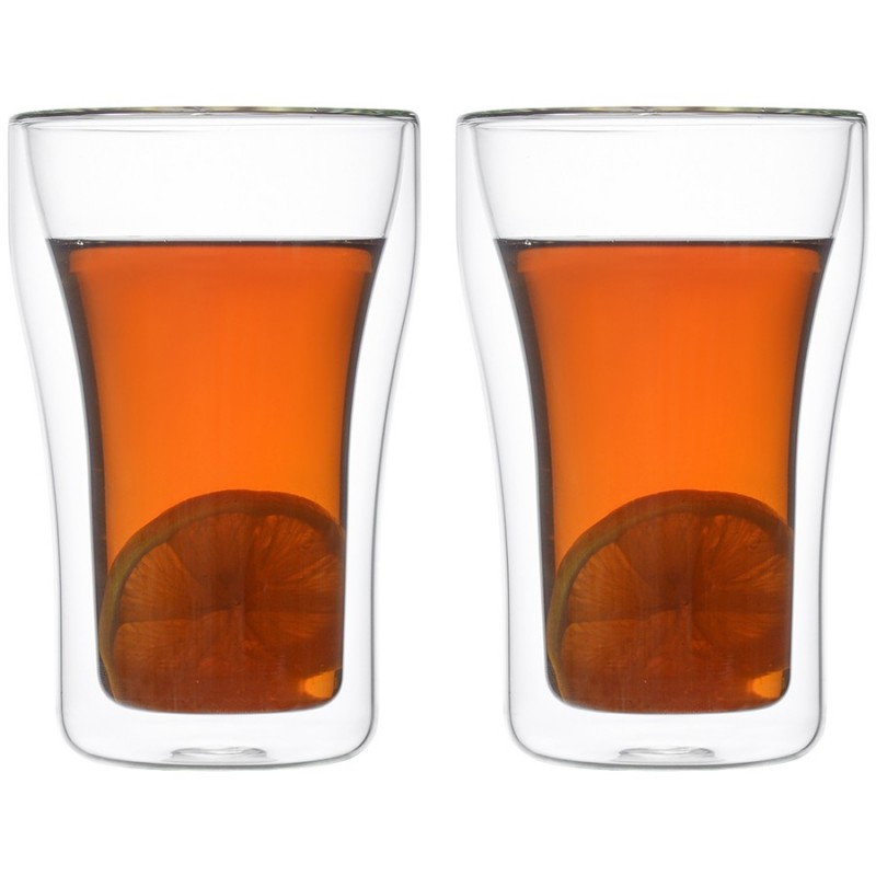 Набор из двух оригинальных стаканов станет отличным приобретением и приятным презентом к празднику. Емкости из прочного боросиликатного стекла с двойными стенками дольше сохраняют температуру холодных и горячих напитков. За счет специального воздушного пространства создается эффект “термоса”. Необычный дизайн привлекает внимание и великолепно вписывается в любую сервировку. Благодаря практичному и устойчивому к износу материалу посуда легко очищается от загрязнений, сохраняет привлекательный вид на протяжении всего срока эксплуатации.Материал: боросиликатное стекло. Объем: 350 мл. Количество предметов в наборе: 2 шт.Посуду рекомендуется очищать от загрязнений в теплой воде с помощью мягкой губки с жидким средством. Допускается мытье в посудомоечной машине. Запрещается использование абразивных материалов и агрессивной бытовой химии.