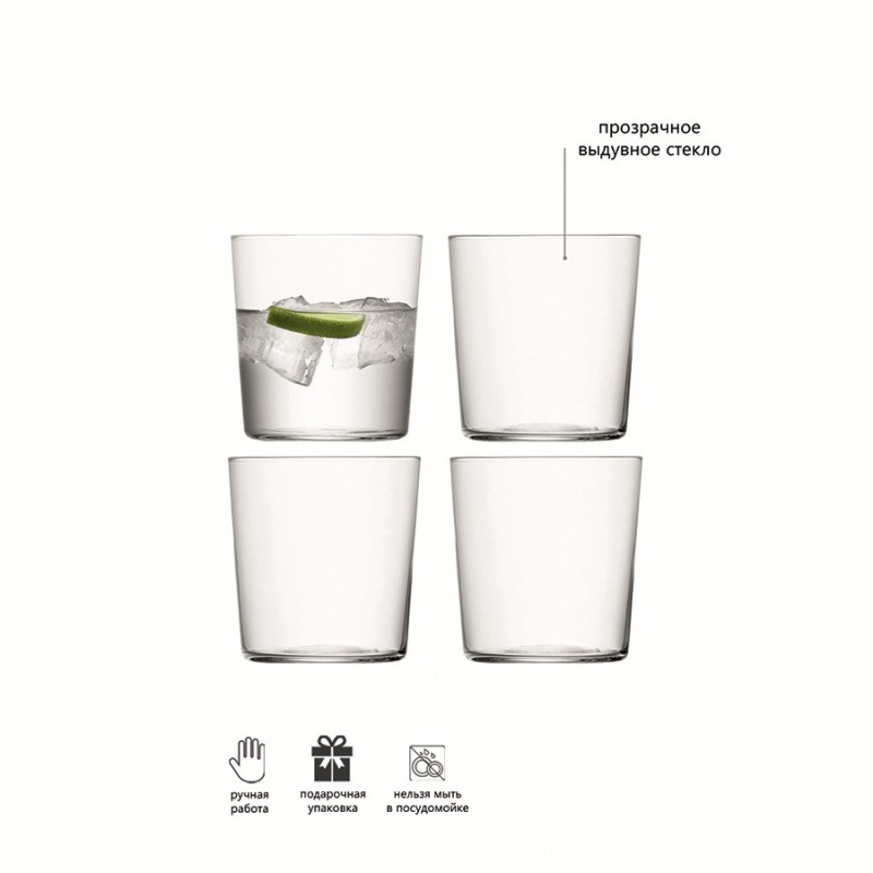 Набор из 4 стаканов Gio отлично подойдет для торжественной или классической сервировки стола в баре, ресторане, кафе или дома. Изделия изготовлены из прочного, абсолютно прозрачного стекла, представлены в традиционной форме, предназначены для любых безалкогольных напитков.Материал: стекло. Объем: 390 мл. Высота: 9 см. Ширина: 8,5 см. Количество в наборе: 4 шт.Можно мыть в посудомоечной машине при низкой температуре с использованием мягкого моющего средства.