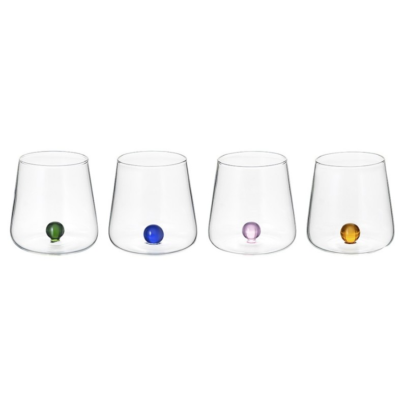 Набор стаканов Orb – прекрасный способ сделать сервировку особенной. Дизайн с яркими акцентами в виде цветных шариков привлекает внимание и эффектно выделяет предметы из данной коллекции на фоне других.Особенности и преимущества:- Боросиликатное стекло, из которого выполнены стаканы, обладает повышенной прочностью и термостойкостью. - Материал легко очищается от загрязнений и не содержит в своем составе вредных соединений. - Декор в виде цветных шариков делает дизайн уникальным и узнаваемым.Материал: боросиликатное стекло. Размеры: 8,9х6,8х9,2 см. Верхний диаметр: 6,8 см. Нижний диаметр: 8,9 см. Толщина стенки: 0,2 см. Объем: 400 мл. Количество в наборе: 4 шт.Стаканы рекомендуется мыть вручную в теплой мыльной воде с помощью мягкой губки. Запрещается использование абразивных материалов и агрессивной бытовой химии.