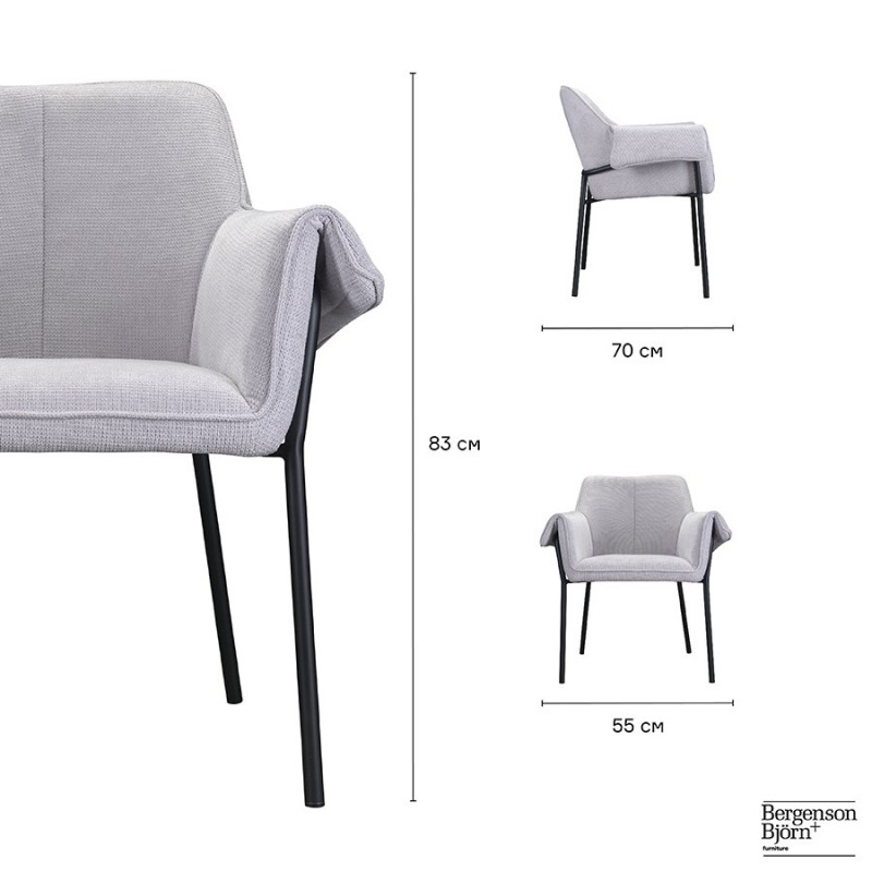 Стул Aline с обивкой из фактурного шенилла выглядит уютно и в то же время благородно. Материал приятный на ощупь и простой в уходе. Комфорт во время отдыха на стуле достигается за счет удобного сиденья с наполнителем из пенополиуретана, высокой наклонной спинки, глубокой посадки и мягких подлокотников. Светлая мебель с лаконичным силуэтом идеально вписывается в интерьер гостиной, рабочего кабинета или спальни, оформленных в скандинавском стиле, лофт, эклектика, фьюжн, неоклассика и др.Материалы: 93% полиэстер, 7% нейлон, фанера, железо, пенополиуретан. Размеры: 70x55x83 см. Максимальная нагрузка: 120 кг. Истираемость ткани по шкале Мартиндейла ?40000. Высота сиденья: 50 см. Ширина сиденья: 41 см. Глубина сиденья: 44 см. Высота спинки: 39 см. Ширина спинки: 42 см Цвет: светло-серый.Рекомендуется регулярно пылесосить мебель с помощью специальной насадки. Загрязнения можно удалять мягкой губкой или салфеткой с мыльным раствором воды.