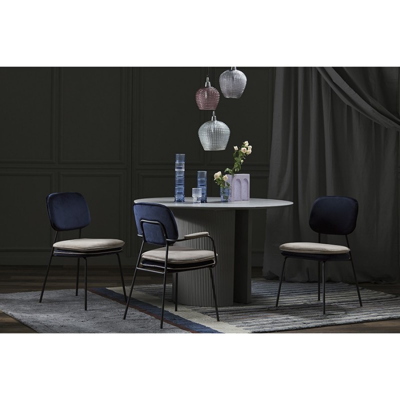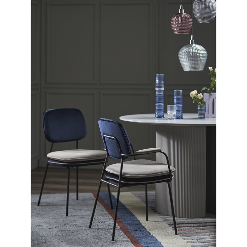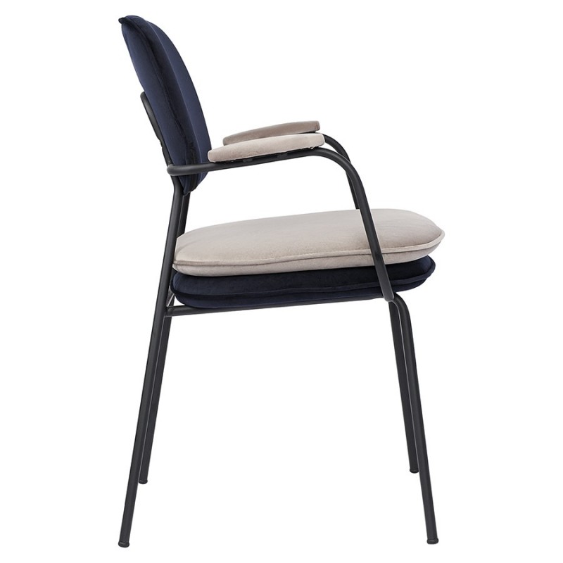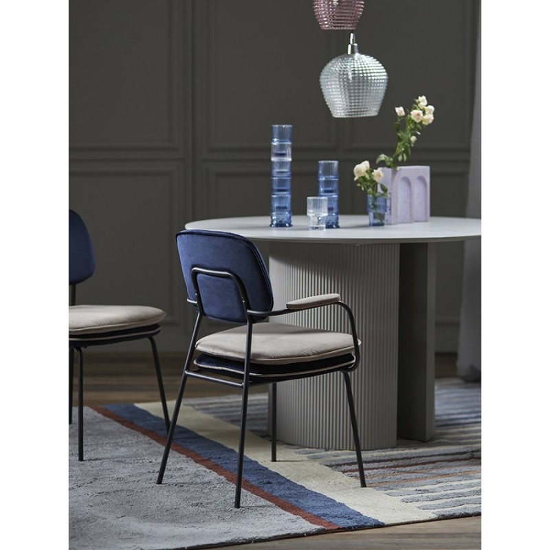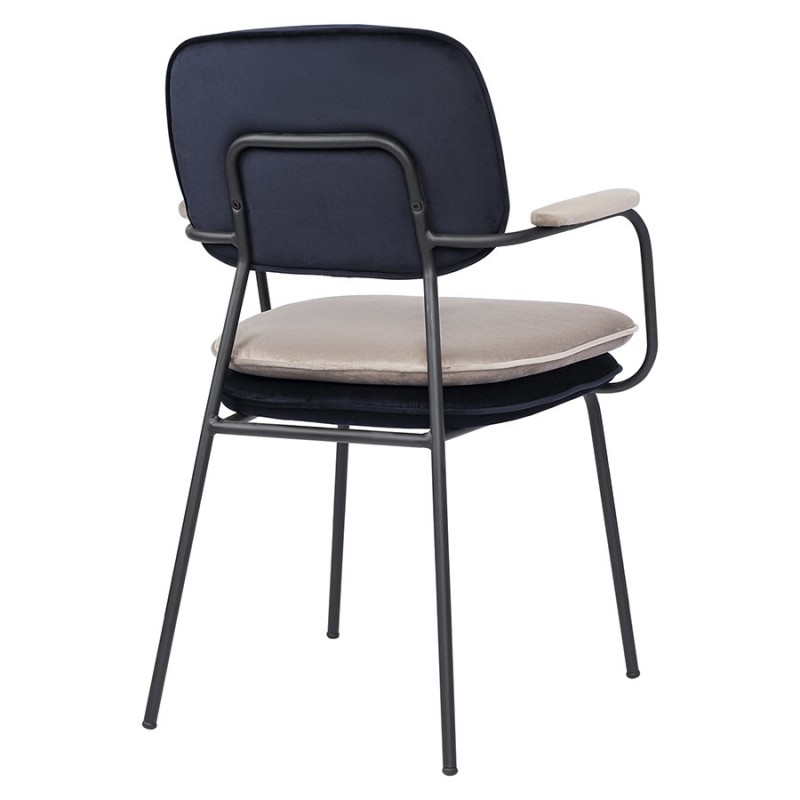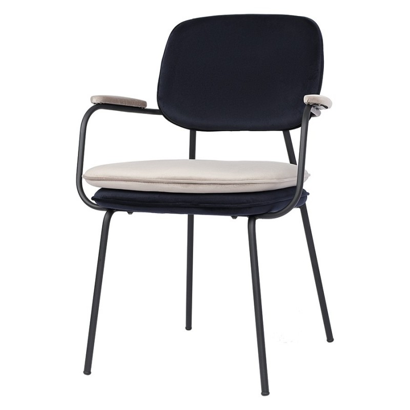 Стул Pea с подлокотниками и мягкой обивкой из бархатистого велюра станет настоящим украшением интерьера и идеальным выбором для ценителей качественной и элегантной мебели.Особенности и преимущества:- Обивка из велюра создает приятные тактильные ощущения, смотрится презентабельно, придавая мебели изысканный вид. - Удобное сиденье с наполнителем из пенополиуретана, спинка и подлокотники с мягкими накладками обеспечивают комфортную посадку. - Ножки из железа имеют порошковое покрытие, которое защищает их поверхность от коррозии, потускнения цвета и механических повреждений. - Стабильная и прочная конструкция делает стул устойчивым, надежным и долговечным. - Дизайн актуален для классических и современных стилевых направлений.Перефразируя слова известного британского дизайнера Уильяма Морриса, дом – это не место для бесполезных и некрасивых вещей, и уникальная коллекция Pea является ярким тому подтверждением. В ее основе лежит сказка “Принцесса на горошине”, и ее главная цель – пробудить ребенка в каждом из нас. Мы верим, что предметы должны быть не просто функциональными, но и нести в себе определенный смысл. Поэтому мебель из нашей новой коллекции не только приносит комфорт в ваш дом, но и рассказывает захватывающую историю.Первыми товарами линейки стали предметы мебели для спальни, сегодня она уже включает в себя пуфы, банкетки и стулья. Главный мотив – двойная подушка, которая напоминает нам о сказочном испытании принцессы. Основные особенности коллекции – пуговицы-горошины, подушки квадратной формы с закругленными краями и оригинальные ножки в виде перевернутой буквы Y, которые делают дизайн живым и непринужденным.Материалы: 100% полиэстер, пенополиуретан, фанера (береза), железо. Высота сиденья: 40 см. Ширина сиденья: 48 см. Глубина сиденья: 45 см. Высота спинки: 29 см. Ширина спинки: 42 см. Высота подлокотников: 15 см. Цвет: темно-синий/бежевый. Максимальная нагрузка: 150 кг.Рекомендуется регулярно пылесосить мебель с помощью специальной насадки – резиновой или мягкой щетки. Образовавшиеся пятна можно удалять губкой или салфеткой со слабым мыльным раствором воды. Запрещается использовать абразивные материалы и агрессивную бытовую химию.