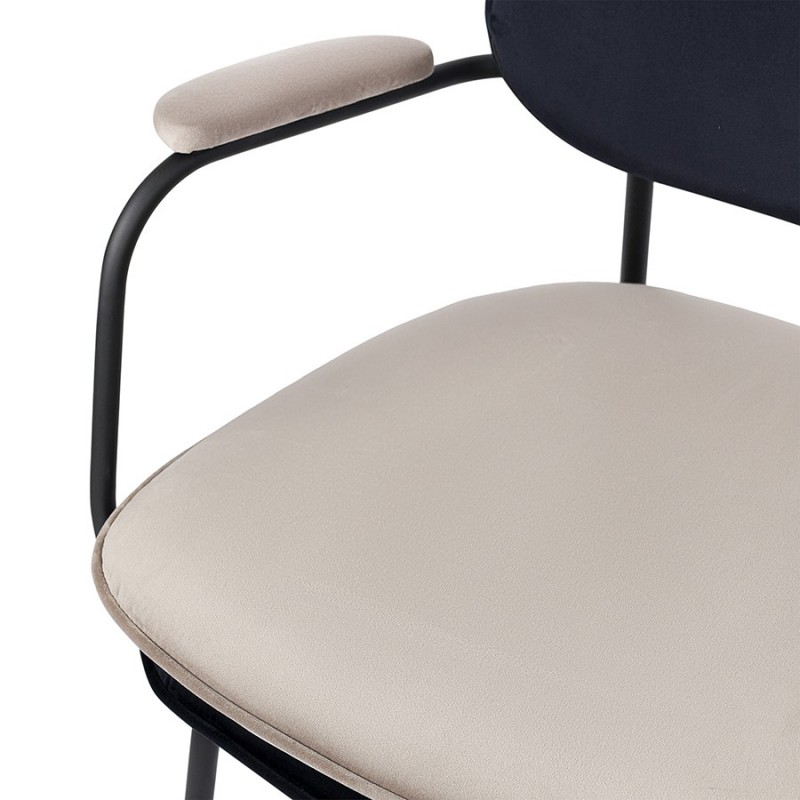 Стул Pea с подлокотниками и мягкой обивкой из бархатистого велюра станет настоящим украшением интерьера и идеальным выбором для ценителей качественной и элегантной мебели.Особенности и преимущества:- Обивка из велюра создает приятные тактильные ощущения, смотрится презентабельно, придавая мебели изысканный вид. - Удобное сиденье с наполнителем из пенополиуретана, спинка и подлокотники с мягкими накладками обеспечивают комфортную посадку. - Ножки из железа имеют порошковое покрытие, которое защищает их поверхность от коррозии, потускнения цвета и механических повреждений. - Стабильная и прочная конструкция делает стул устойчивым, надежным и долговечным. - Дизайн актуален для классических и современных стилевых направлений.Перефразируя слова известного британского дизайнера Уильяма Морриса, дом – это не место для бесполезных и некрасивых вещей, и уникальная коллекция Pea является ярким тому подтверждением. В ее основе лежит сказка “Принцесса на горошине”, и ее главная цель – пробудить ребенка в каждом из нас. Мы верим, что предметы должны быть не просто функциональными, но и нести в себе определенный смысл. Поэтому мебель из нашей новой коллекции не только приносит комфорт в ваш дом, но и рассказывает захватывающую историю.Первыми товарами линейки стали предметы мебели для спальни, сегодня она уже включает в себя пуфы, банкетки и стулья. Главный мотив – двойная подушка, которая напоминает нам о сказочном испытании принцессы. Основные особенности коллекции – пуговицы-горошины, подушки квадратной формы с закругленными краями и оригинальные ножки в виде перевернутой буквы Y, которые делают дизайн живым и непринужденным.Материалы: 100% полиэстер, пенополиуретан, фанера (береза), железо. Высота сиденья: 40 см. Ширина сиденья: 48 см. Глубина сиденья: 45 см. Высота спинки: 29 см. Ширина спинки: 42 см. Высота подлокотников: 15 см. Цвет: темно-синий/бежевый. Максимальная нагрузка: 150 кг.Рекомендуется регулярно пылесосить мебель с помощью специальной насадки – резиновой или мягкой щетки. Образовавшиеся пятна можно удалять губкой или салфеткой со слабым мыльным раствором воды. Запрещается использовать абразивные материалы и агрессивную бытовую химию.