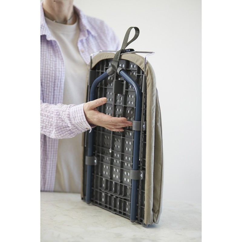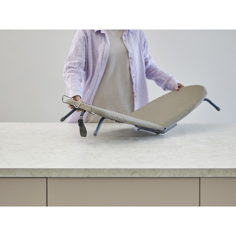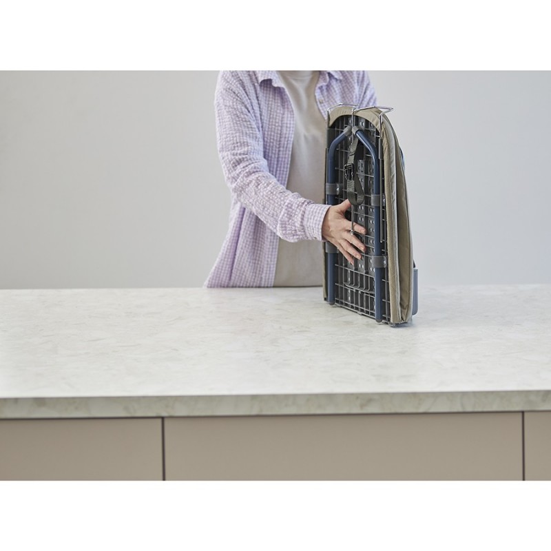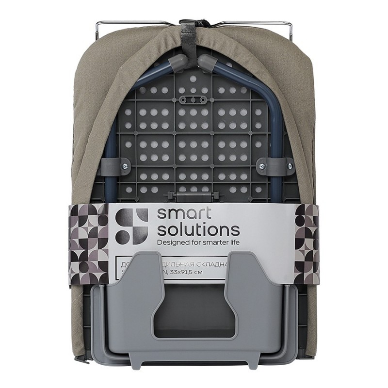 Smart Iron – практичная и удобная в использовании гладильная доска со складной конструкцией, которая подходит для любой твердой поверхности. Компактность, мобильность и современный дизайн делают ее идеальным решением для небольших пространств, студий, съемного жилья и путешествий.Особенности и преимущества:- Доску можно устанавливать на любую твердую поверхность и надежно закреплять в разложенном состоянии с помощью специального фиксатора. - Удобный механизм раскладывания обеспечивает ровную поверхность для глажки без явно выраженного стыка. - Складная конструкция и наличие специальной петли для подвешивания на стену обеспечивают ее компактное хранение даже в ограниченном пространстве. - Чехол из 100% хлопка с увеличенной плотностью 180 г/м2 (вид плетения - сатин) и 5-мм прослойкой из фетра содает оптимальной баланс мягкости и упругости, хорошо впитывает влагу и быстро сохнет. - Выдвижная металлическая подставка для утюга гарантирует удобное и безопасное использование. - Ножки с защитными пластиковыми колпачками не скользят и не царапают рабочую поверхность. - Предусмотрен специальный “карман” для хранения утюга, который при необходимости легко складывается “гармошкой”.Материалы: сталь, полипропилен, термопластик, хлопок, фетр, поролон. Размеры доски в разложенном состоянии: 33х13х91,5 см. Размеры доски в сложенном состоянии: 33х12х46 см. Размер гладильной поверхности: 91,5х33 см. Длина подставки для утюга: 17 см. Длина крючка: 9 см.Рекомендована сухая чистка чехла.