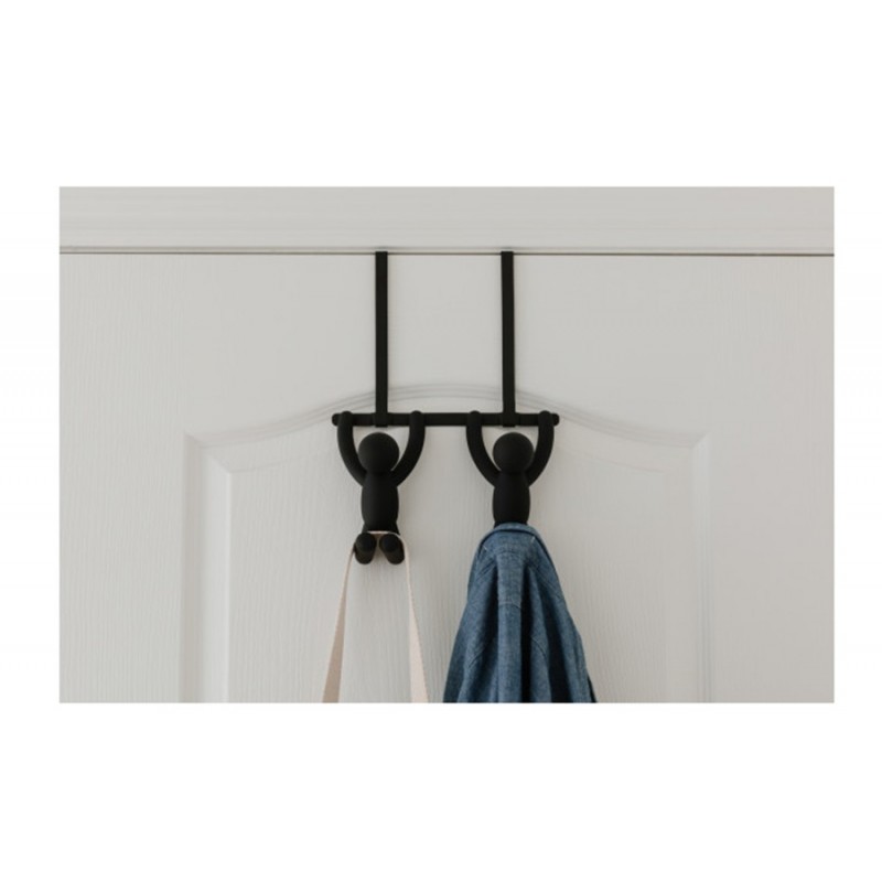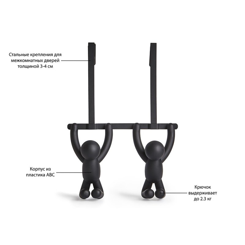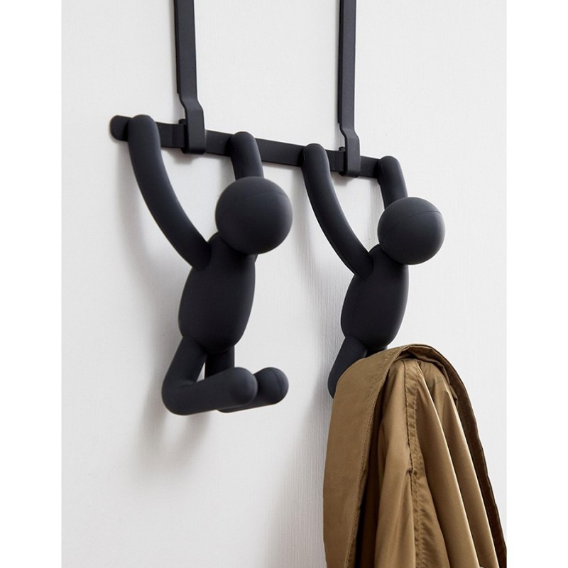 Надверная вешалка Buddy – оригинальное приспособление для хранения одежды. Авторами дизайна выступили Alan Wisniewski и Wesley Chau.Основание выполнено из сверхпрочного АБС-пластика, устойчивого к износу и воздействию влаги. Конструкция оснащена надежной панелью для удобного крепления к дверям без вкручивания дюбелей или использования клея. Крючки в виде забавных человечков способны выдерживать нагрузку до 2,3 кг.Материалы: АБС-пластик, сталь, этиленвинилацетат. Размеры: 21,6х11х30 см.Пыль и загрязнения с поверхностей можно удалять при помощи мягкого влажного материала. После очищения вешалку рекомендуется протереть сухой салфеткой.