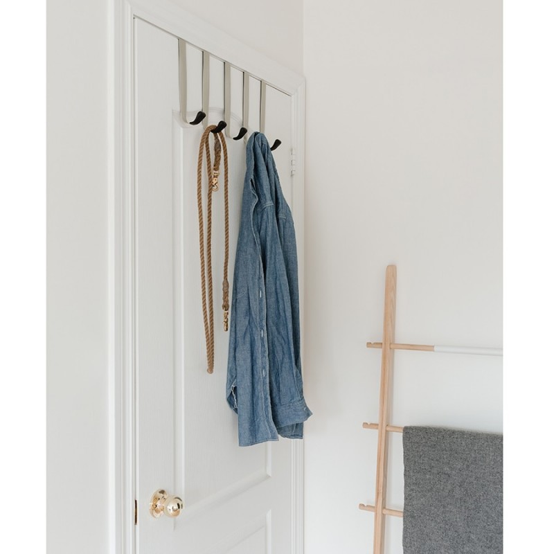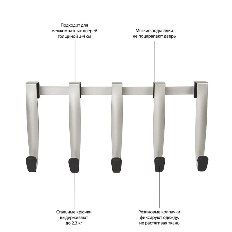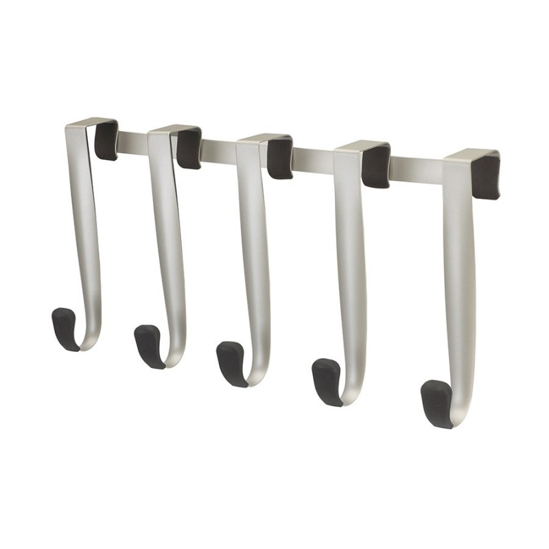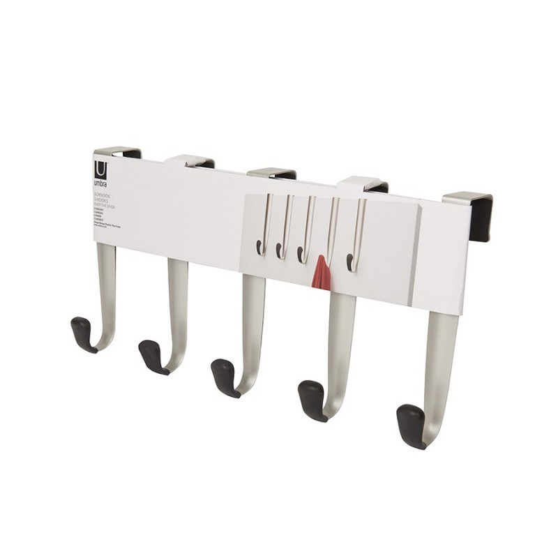 Надверная вешалка Schnook идеально дополнит интерьер кухни, прихожей или ванной комнаты. Автором идеи создания многофункциональной вешалки для дома стал талантливый дизайнер Thea Yuzyk.Аксессуар выполнен из штампованного металла высокого качества. Благодаря никелевому покрытию изделие не поддается коррозии и сохраняет привлекательный вид на протяжении всего срока эксплуатации. Изделие легко крепится к дверям без использования клея и дюбелей. Специальная накладка препятствует скольжению вешалки по поверхности. Аксессуар снабжен пятью крючками с резиновыми наконечниками, защищающими одежду от повреждений.Материалы: сталь, полипропилен.