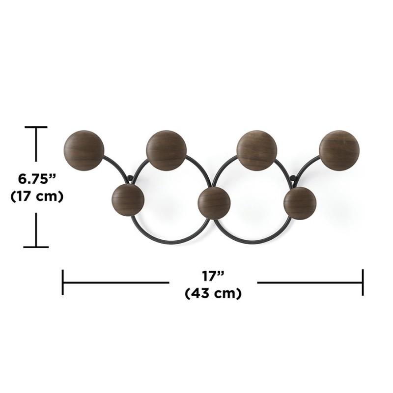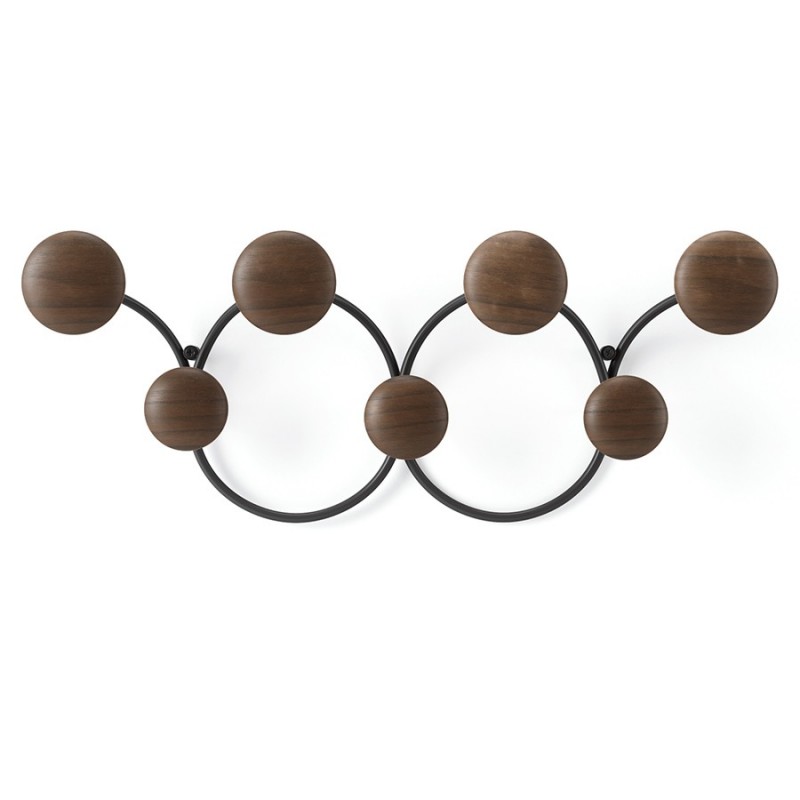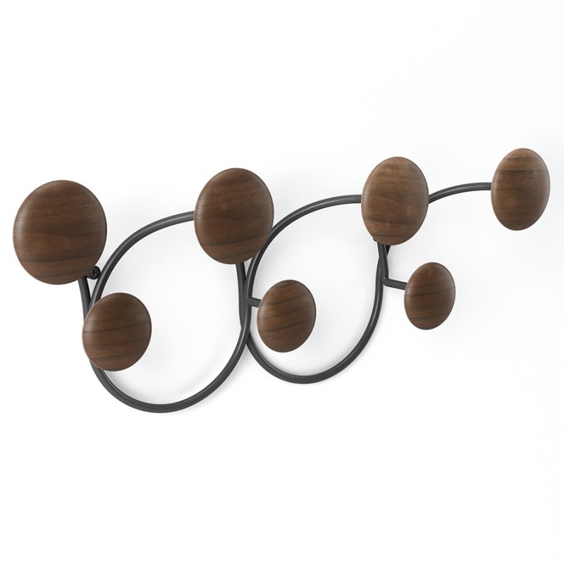 Вешалка для одежды Dotsy – стильное и практичное решение для современной прихожей. Прочное стальное основание обеспечивает изделию надежность и долговечность. Крючки из древесины сосны округлой формы с гладкой поверхностью исключают случайное повреждение одежды, выдерживают нагрузку до 2,3 кг каждый. Сочетание дерева и металла органично вписывается в различные варианты оформления интерьера. Конструкция крепится к стене на два шурупа.Материалы: сосна, сталь. Размеры: 43x10x17 см. Вес: 440 г. Максимальная нагрузка: 2,3 кг. Цвет: черный/орех.Пыль и загрязнения с поверхностей можно удалять при помощи мягкого влажного материала. После очищения вешалку рекомендуется протереть сухой салфеткой.