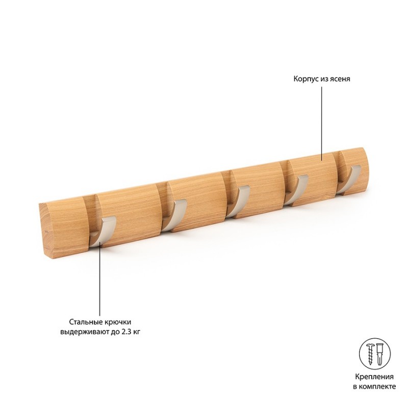 Вешалка настенная flip, 50,8 см, натуральное дерево, 5 крючков (артикул 726)