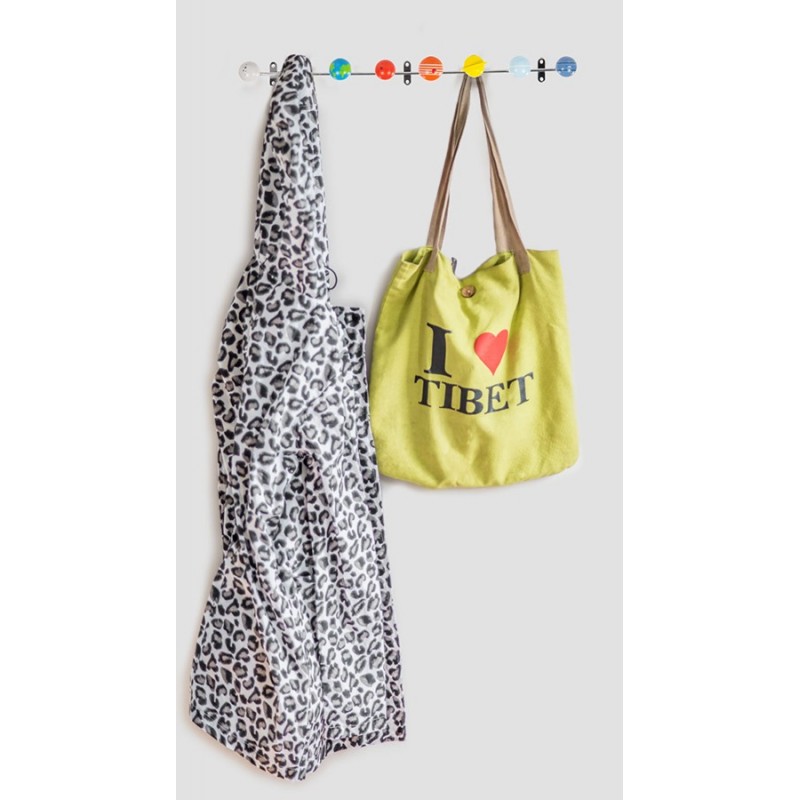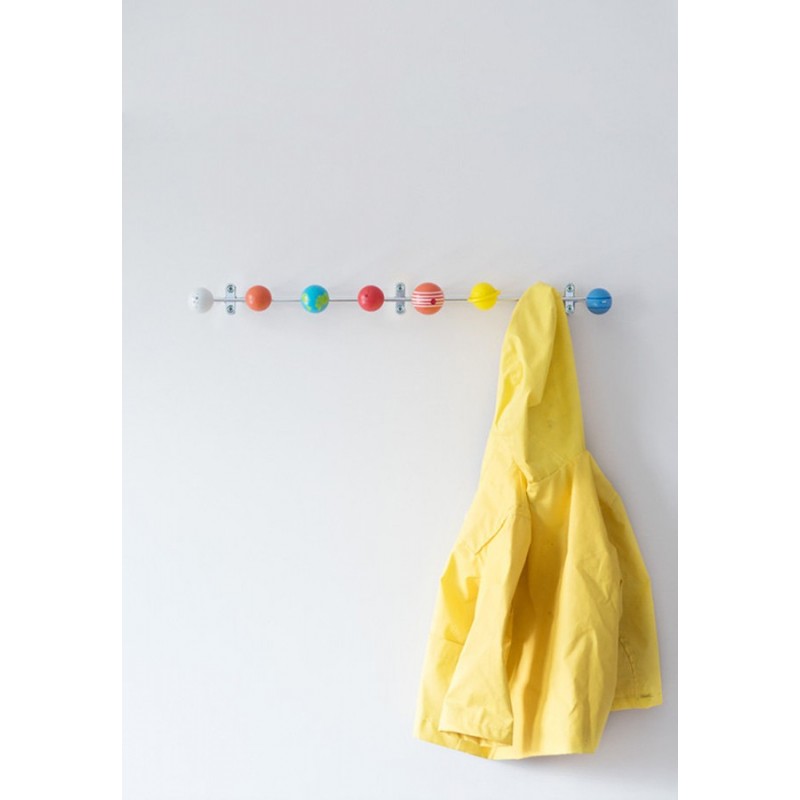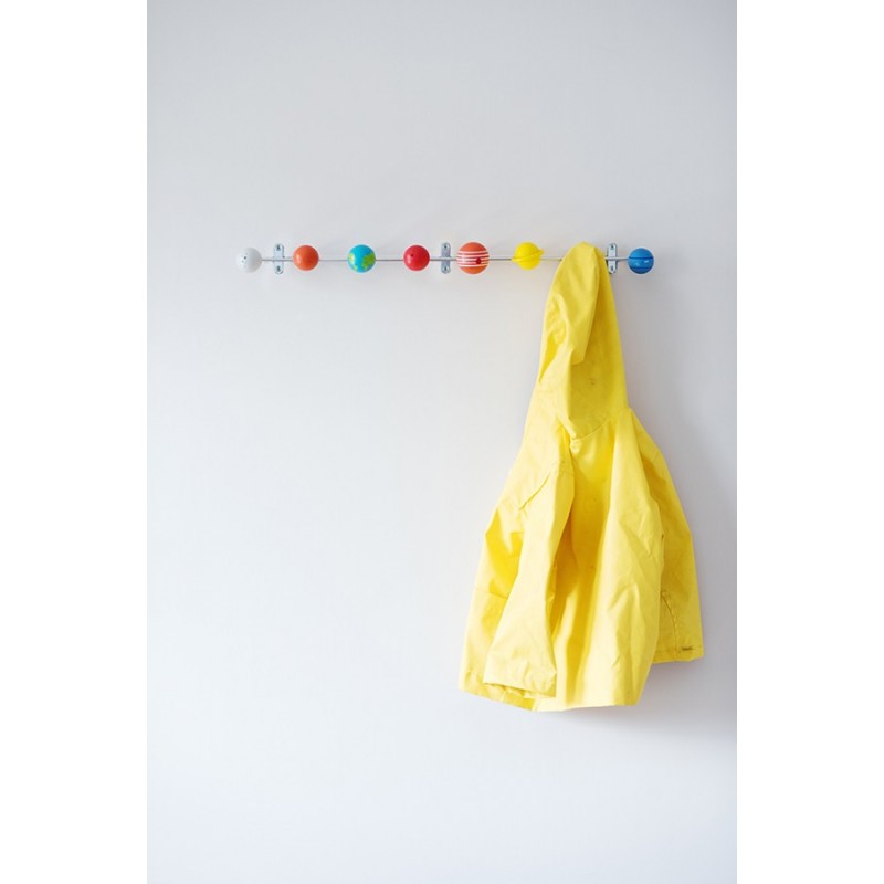 Оригинальная настенная вешалка Solar System поможет вам не только аккуратно повесить верхнюю одежду и аксессуары, но и стильно украсить интерьер прихожей. Это идеальный вариант для случаев, когда нет возможности разместить в помещении громоздкий шкаф или стенку либо не хочется захламлять пространство лишней мебелью.Вешалка имеет нестандартный дизайн и яркое цветовое оформление. Каждый крючок выполнен в виде одной из планет Солнечной системы, благодаря чему такой предмет сразу привлекает внимание и становится визуальным центром интерьера прихожей. Металлическая планка легко крепится к стене при помощи шурупов. Крючки-«планеты» изготовлены из натурального дерева и окрашены безопасной краской.Дизайн Andy MasonРазмеры: 53.5х42х62 см Вес: 0.266 кг