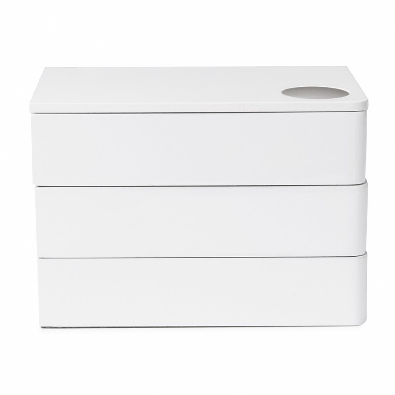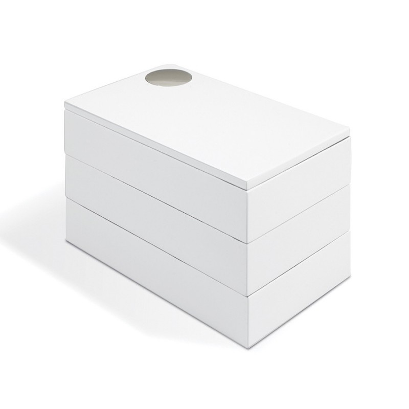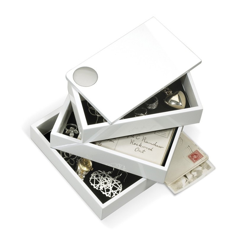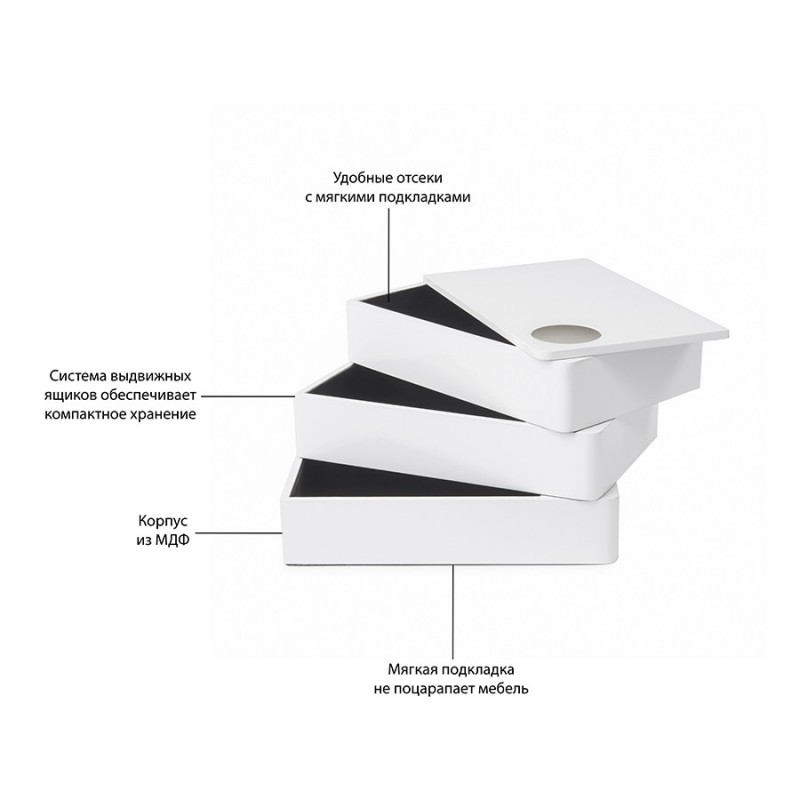 Шкатулка позаботится о ваших украшениях и станет настоящим декоративным элементом на туалетном столике.Шкатулка оборудована надежной магнитной защелкой. Три отделения позволяют хранить кольца, серьги, браслеты, часы, ожерелья и другие аксессуары. Ящики и дно шкатулки защищены мягкой тканью для предотвращения повреждений украшений и мебели. Ящики вращаются на шарнире, поворачиваясь на 360 градусов.Материал: МДФ, цинк. Размеры: 19х12х13 см. Цвет: белый.Пыль и загрязнения удалять при помощи мягкой салфетки. Запрещается использование агрессивной бытовой химии и абразивных материалов.