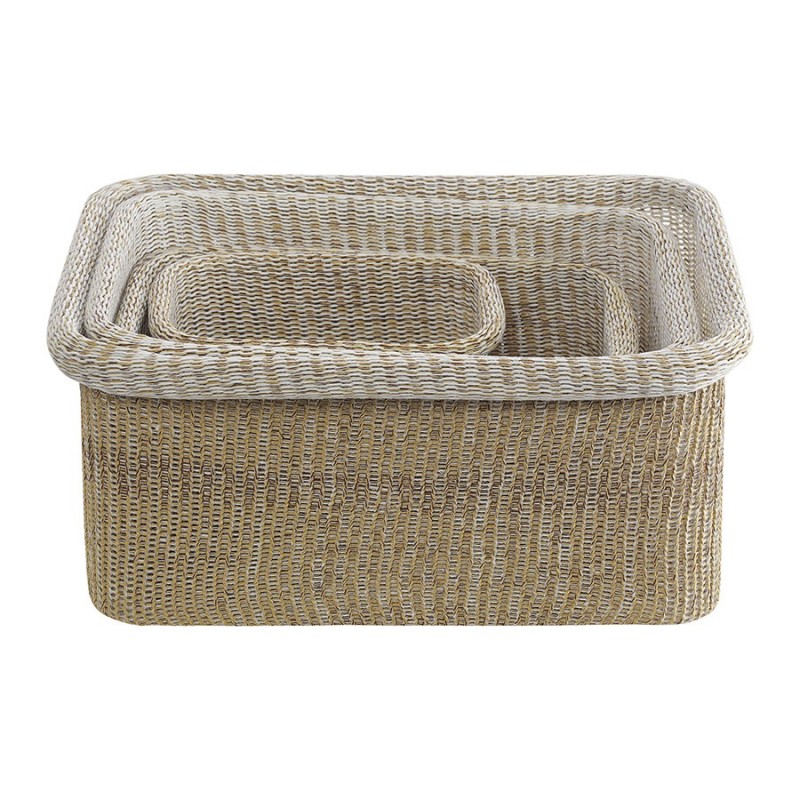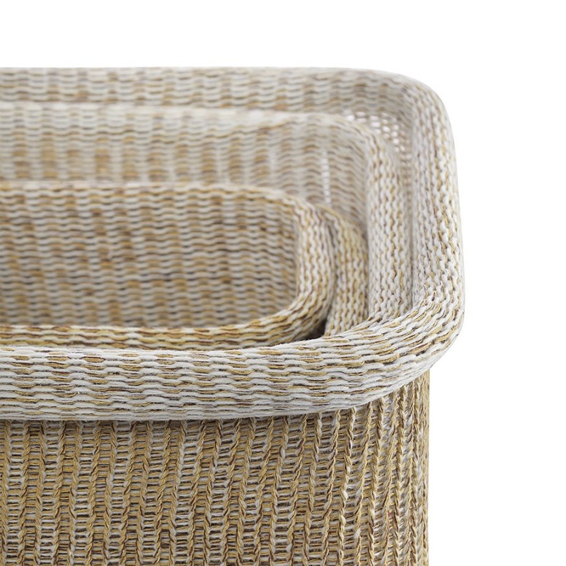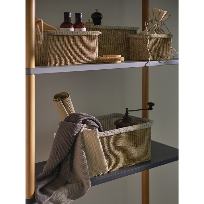 Корзины для хранения Sustainable collection сочетают в себе трендовый дизайн в эко-стиле и высокую практичность, что делает их идеальным выбором для организации пространства вашего дома. Они могут стать акцентным элементом интерьера, использоваться в шкафу и любой из комнат для хранения белья, детских игрушек и любых других вещей.Особенности и преимущества:- Изделия выполнены из биоразлагаемых материалов, согласно стандарту GRS, – приобретая их, вы проявляете заботу об экологии. - Благодаря тугому плетению корзины прочные, при этом легкие и хорошо держат форму. - Компактные, при этом вместительные – для удобного хранения их можно штабелировать. - Текстильные аксессуары с вязаной фактурой идеально вписываются в интерьер в стиле эко, кантри, прованс или рустик.Как разгладить заломы на текстильной корзине:1. Достаньте корзину из транспортной упаковки. 2. Расправьте ее и распрямите заломы вручную, насколько это возможно. 3. Плотно заполните корзину подушками или любыми мягкими материалами. 4. Через несколько дней она вернется к изначальному виду. 5. Для устранения заломов вы также можете использовать отпариватель.Материалы: полиэстер, хлопок, железо. Размеры корзин: 30х42х19,5 см; 27х37х18,5 см; 22х32х17 см; 17х22,5х13,5 см. Цвет: бежевый. Количество в наборе: 4 шт. Максимальная нагрузка: 17 кг, 13 кг, 8 кг, 3,5 кг.Допускается ручная чистка мягкой губкой.