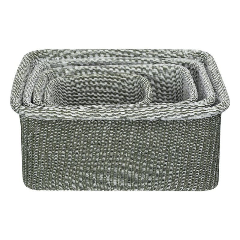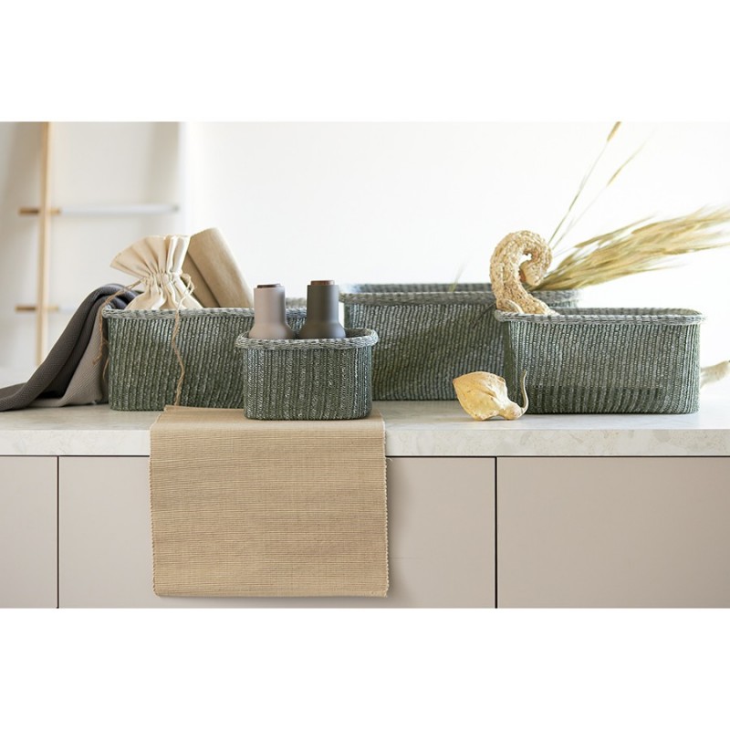 Корзины для хранения Sustainable collection сочетают в себе трендовый дизайн в эко-стиле и высокую практичность, что делает их идеальным выбором для организации пространства вашего дома. Они могут стать акцентным элементом интерьера, использоваться в шкафу и любой из комнат для хранения белья, детских игрушек и любых других вещей.Особенности и преимущества:- Изделия выполнены из биоразлагаемых материалов, согласно стандарту GRS, – приобретая их, вы проявляете заботу об экологии. - Благодаря тугому плетению корзины прочные, при этом легкие и хорошо держат форму. - Компактные, при этом вместительные – для удобного хранения их можно штабелировать. - Текстильные аксессуары с вязаной фактурой идеально вписываются в интерьер в стиле эко, кантри, прованс или рустик.Как разгладить заломы на текстильной корзине:1. Достаньте корзину из транспортной упаковки. 2. Расправьте ее и распрямите заломы вручную, насколько это возможно. 3. Плотно заполните корзину подушками или любыми мягкими материалами. 4. Через несколько дней она вернется к изначальному виду. 5. Для устранения заломов вы также можете использовать отпариватель.Материалы: полиэстер, хлопок, железо. Размеры корзин: 30х42х19,5 см; 27х37х18,5 см; 22х32х17 см; 17х22,5х13,5 см. Цвет: оливковый. Количество в наборе: 4 шт. Максимальная нагрузка: 17 кг, 13 кг, 8 кг, 3,5 кг.Допускается ручная чистка мягкой губкой.