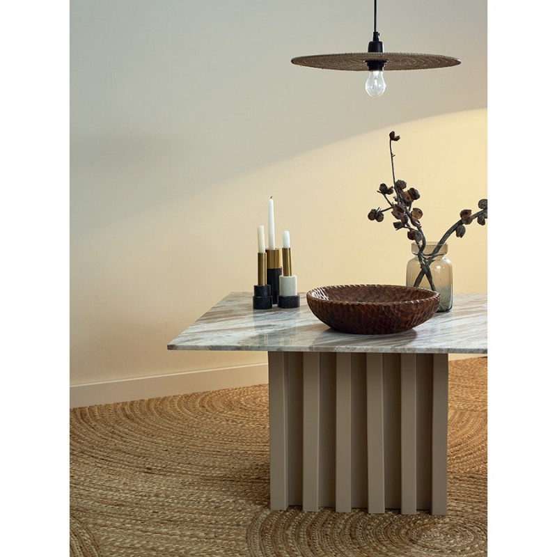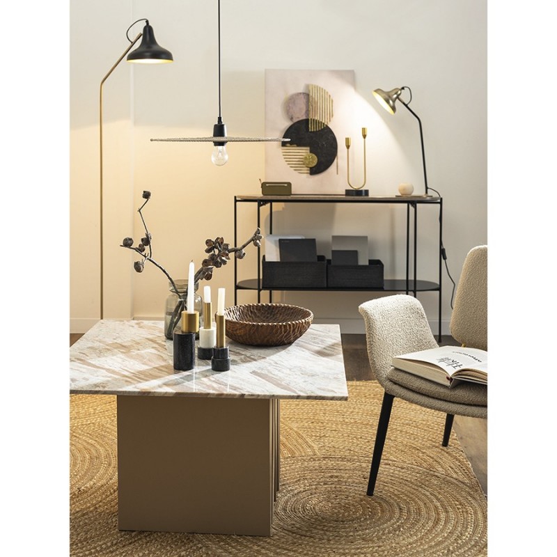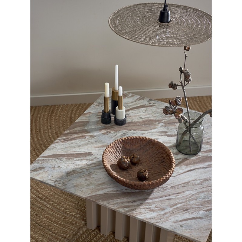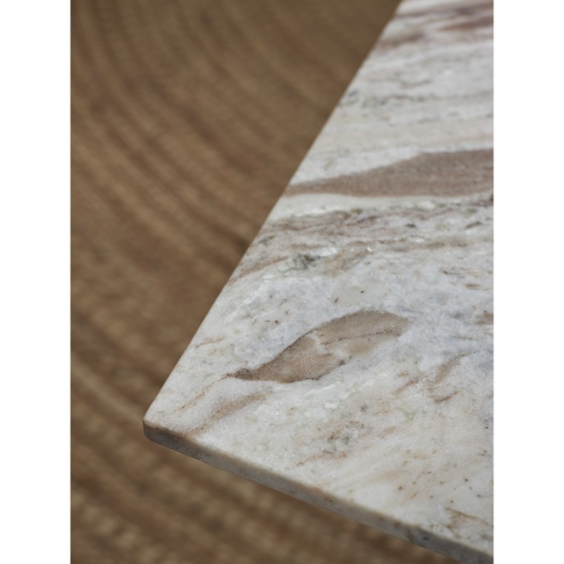 Столик журнальный Mojo от бренда Bergenson Bjorn – прекрасное сочетание эстетики и функциональности. Основание из железа придает мебели современный вид, а столешница из мрамора добавляет дизайну элегантность. Модель идеально подходит для размещения в центре гостиной или уютной зоны отдыха. Столик придаст интерьеру индивидуальность и шарм, станет удобным местом для хранения книг, журналов и демонстрации декора.Особенности и преимущества:- Основание изготовлено из железа, что обеспечивает конструкции надежность и долговечность. - Столешница из мрамора придает столику изысканный вид, обладает прочностью, не требует сложного ухода. - Дизайн великолепно гармонирует как с современными, так и классическими интерьерными решениями.! Обращаем ваше внимание, что этот предмет мебели изготовлен вручную и может быть не идеален. Небольшие неровности, потертости и различия в цвете – это не брак, а индивидуальная особенность товара, произведенного ручным способом.Материалы: железо, мрамор. Размеры: 85х85 см. Максимальная нагрузка: 20 кг. Цвет: бежевый.Важно!Натуральный мрамор не обладает водоотталкивающим эффектом. Структура материала пористая, из-за чего он может впитывать жидкости и другие вещества. Чтобы защитить поверхность от пятен, ее можно обработать специальными защитными средствами (пропитки для мрамора).Как ухаживать за поверхностью из мрамора:1) Чтобы очистить поверхность из мрамора, протрите ее слегка влажной тканью, избегая длительного контакта с водой. Можно использовать мягкие чистящие жидкости, но не абразивные и не кислотные средства. 2) Образовавшиеся пятна можно очистить с помощью специальных средств для каменных поверхностей. 3) Защитная обработка: регулярно наносите защитный слой из пропитки для мрамора. Это позволит защитить поверхность и сделать ее более герметичной, устойчивой к появлению пятен. Можно использовать любую пропитку, которая подходит для натурального мрамора. 4) Использовать пропитку рекомендуется 1 раз в 6–12 месяцев, но не менее 1 раза в год, чтобы поддерживать ее защитный барьер от влаги, масел и грязи. Эта профилактическая мера помогает сохранить идеальный внешний вид камня и продлить срок его службы. 5) Постарайтесь избегать попадания масла и кислотных жидкостей на поверхность столешницы. Любую пролитую жидкость вытирайте насухо сразу же. 6) Во избежание появления новых пятен, используйте подставки под блюда, кружки, бокалы. 7) Не ставьте горячие и холодные емкости непосредственно на столешницу. 8) Не режьте на столешнице.