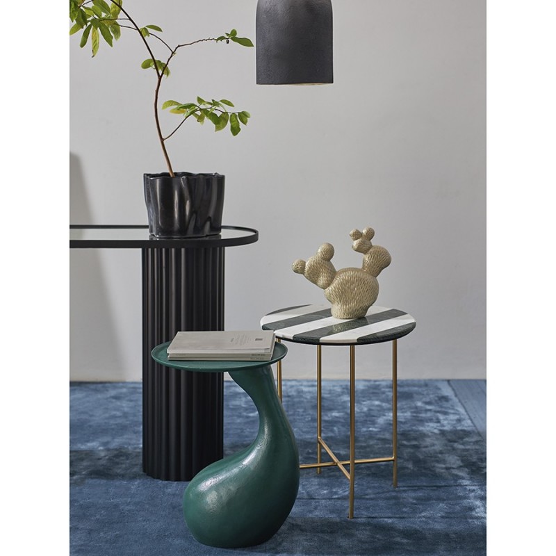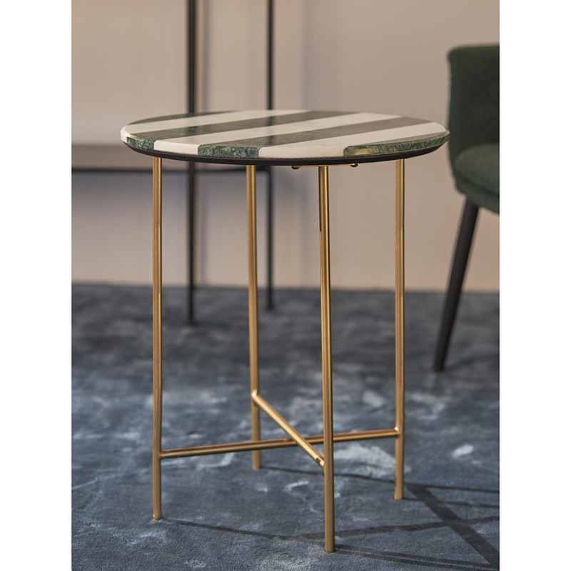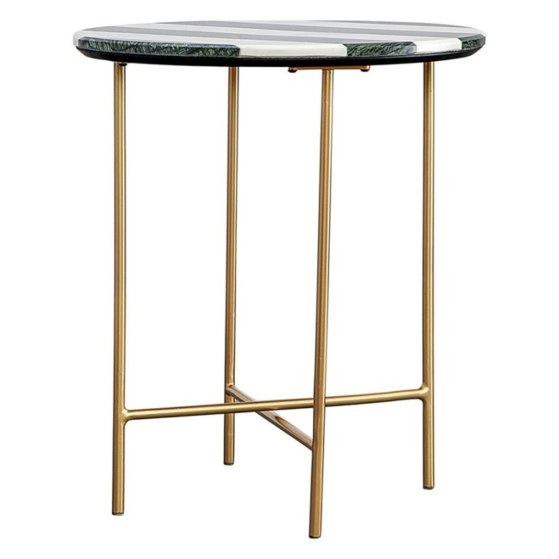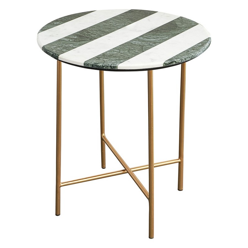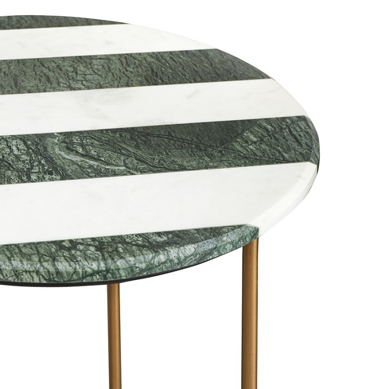 Столик приставной Haywi – идеальное решение для тех, кто ценит уникальный стиль и функциональность. Этот предмет мебели может использоваться в любых комнатах в качестве дополнительной поверхности для размещения различных предметов и стильного акцента интерьера.Особенности и преимущества:- Железные ножки делают конструкцию устойчивой и надежной. - Мраморная столешница смотрится презентабельно, легко очищается и гарантирует долговечную эксплуатацию. - Благодаря диаметру 45 см столик легко помещается в небольших пространствах и позволяет экономить место. - Сочетание столешницы с полосатым узором и ножек с золотистым покрытием создает интересный визуальный эффект, который добавляет особый шарм в любое пространство.! Обращаем ваше внимание, что этот предмет мебели изготовлен вручную и может быть не идеален. Небольшие неровности, потертости и различия в цвете – это не брак, а индивидуальная особенность товара, произведенного ручным способом.Материалы: железо, мрамор, МДФ. Диаметр: 45 см. Цвет: серо-белый.Важно!Натуральный мрамор не обладает водоотталкивающим эффектом. Структура материала пористая, из-за чего он может впитывать жидкости и другие вещества. Чтобы защитить поверхность от пятен, ее можно обработать специальными защитными средствами (пропитки для мрамора).Как ухаживать за поверхностью из мрамора:1) Чтобы очистить поверхность из мрамора, протрите ее слегка влажной тканью, избегая длительного контакта с водой. Можно использовать мягкие чистящие жидкости, но не абразивные и не кислотные средства. 2) Образовавшиеся пятна можно очистить с помощью специальных средств для каменных поверхностей. 3) Защитная обработка: регулярно наносите защитный слой из пропитки для мрамора. Это позволит защитить поверхность и сделать ее более герметичной, устойчивой к появлению пятен. Можно использовать любую пропитку, которая подходит для натурального мрамора. 4) Использовать пропитку рекомендуется 1 раз в 6–12 месяцев, но не менее 1 раза в год, чтобы поддерживать ее защитный барьер от влаги, масел и грязи. Эта профилактическая мера помогает сохранить идеальный внешний вид камня и продлить срок его службы. 5) Постарайтесь избегать попадания масла и кислотных жидкостей на поверхность столешницы. Любую пролитую жидкость вытирайте насухо сразу же. 6) Во избежание появления новых пятен, используйте подставки под блюда, кружки, бокалы. 7) Не ставьте горячие и холодные емкости непосредственно на столешницу. 8) Не режьте на столешнице.