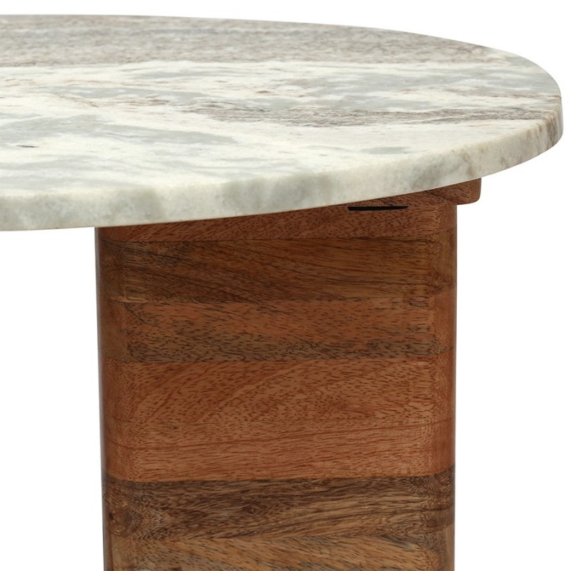 Столик приставной Torhill от дизайнерского бренда Bergenson Bjorn – элегантное и функциональное дополнение к любому интерьеру. Столешница из мрамора и основание из мангового дерева создают прекрасный тандем, который привносит в интерьер ощущение гармонии и единения с природой.Особенности и преимущества:- Материалы выдерживают испытание временем, сохраняя привлекательный вид и первоначальные характеристики. - Столешница из мрамора делает модель интересной, объединяя в себе природную красоту, практичность и долговечность. - Основание из мангового дерева делает мебель устойчивой и надежной, а ее дизайн – уникальным, с налетом экзотики. - Универсальность мрамора и естественный оттенок древесины позволяют вписать столик в интерьер, оформленный в любой цветовой гамме.! Обращаем ваше внимание, что этот предмет мебели изготовлен вручную и может быть не идеален. Небольшие неровности, потертости и различия в цвете – это не брак, а индивидуальная особенность товара, произведенного ручным способом.Материал: манговое дерево, мрамор. Размеры: 50x35x38 см. Максимальная нагрузка: 20 кг. Цвет: бежевый/мрамор.Важно!Натуральный мрамор не обладает водоотталкивающим эффектом. Структура материала пористая, из-за чего он может впитывать жидкости и другие вещества. Чтобы защитить поверхность от пятен, ее можно обработать специальными защитными средствами (пропитки для мрамора).Как ухаживать за поверхностью из мрамора:1) Чтобы очистить поверхность из мрамора, протрите ее слегка влажной тканью, избегая длительного контакта с водой. Можно использовать мягкие чистящие жидкости, но не абразивные и не кислотные средства. 2) Образовавшиеся пятна можно очистить с помощью специальных средств для каменных поверхностей. 3) Защитная обработка: регулярно наносите защитный слой из пропитки для мрамора. Это позволит защитить поверхность и сделать ее более герметичной, устойчивой к появлению пятен. Можно использовать любую пропитку, которая подходит для натурального мрамора. 4) Использовать пропитку рекомендуется 1 раз в 6–12 месяцев, но не менее 1 раза в год, чтобы поддерживать ее защитный барьер от влаги, масел и грязи. Эта профилактическая мера помогает сохранить идеальный внешний вид камня и продлить срок его службы. 5) Постарайтесь избегать попадания масла и кислотных жидкостей на поверхность столешницы. Любую пролитую жидкость вытирайте насухо сразу же. 6) Во избежание появления новых пятен, используйте подставки под блюда, кружки, бокалы. 7) Не ставьте горячие и холодные емкости непосредственно на столешницу. 8) Не режьте на столешнице.